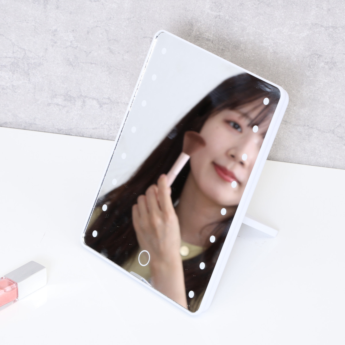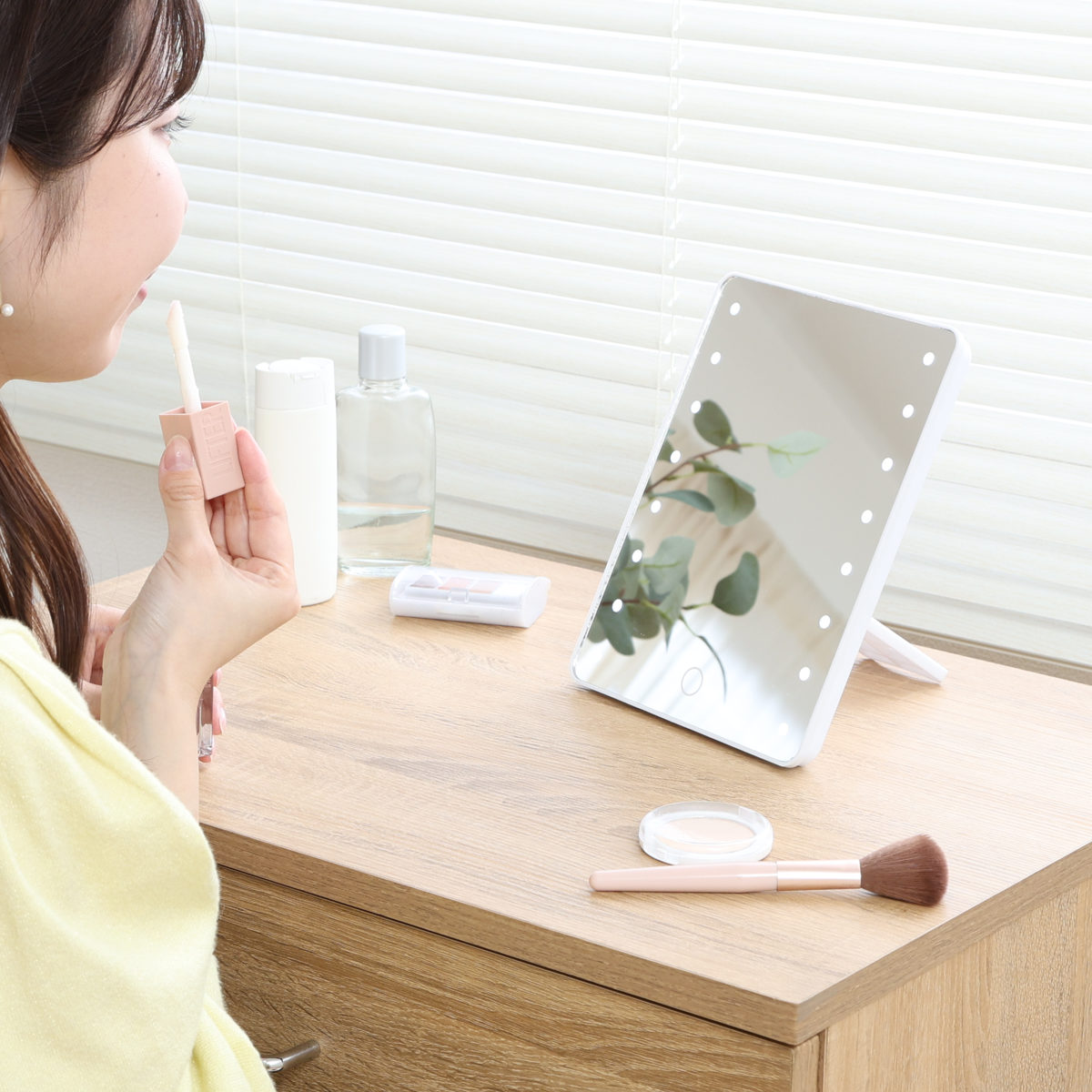 LEDライト付き卓上ミラー鏡のフチに16個のLEDライトが埋め込まれた卓上ミラーです。自然光が入りにくいお部屋や、時間帯によって明るさが足りない時でも顔全体をムラなく照らし、細かな部分までしっかり確認できます。