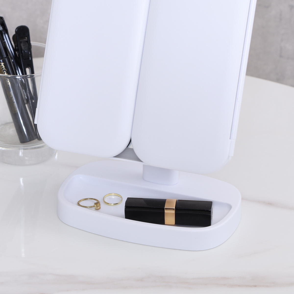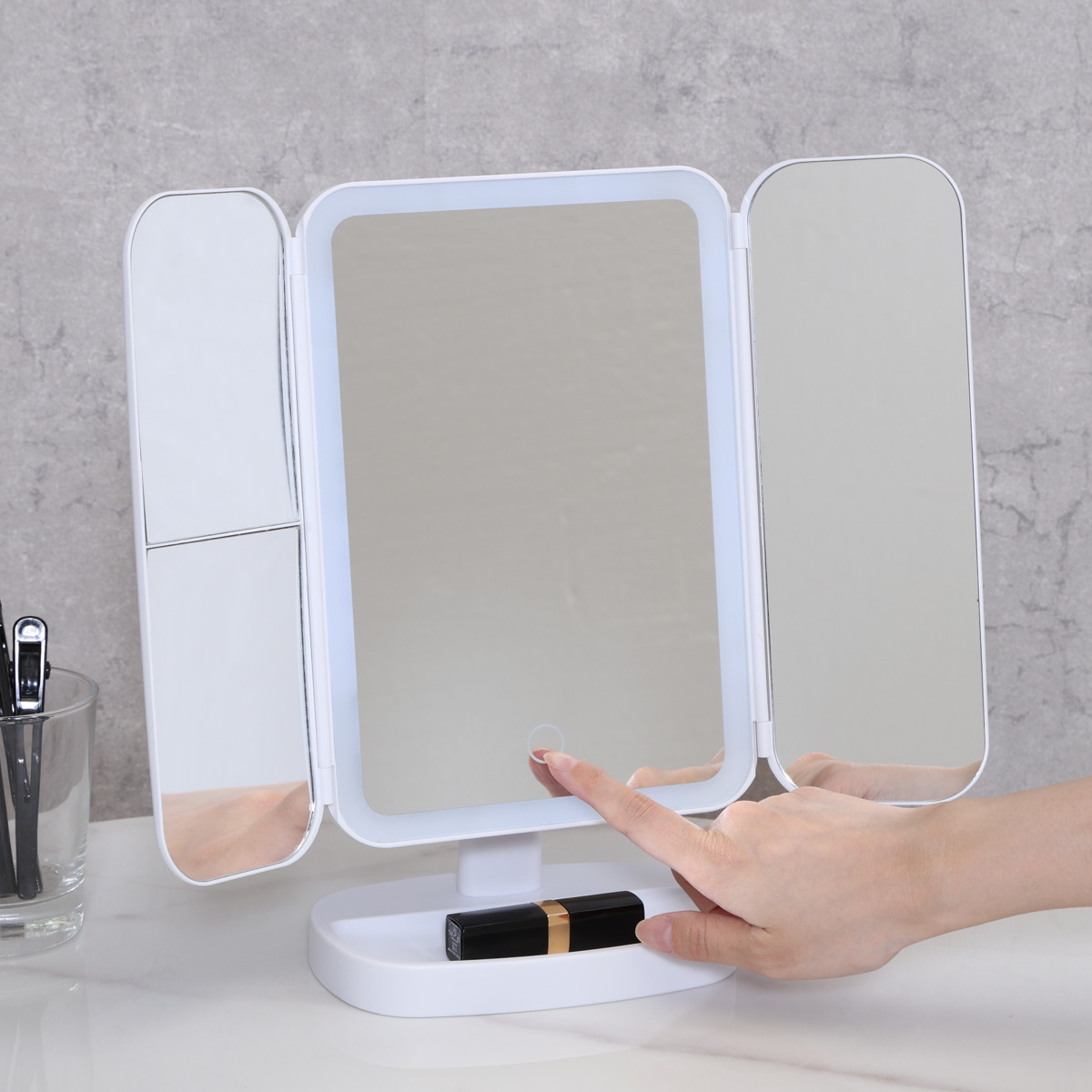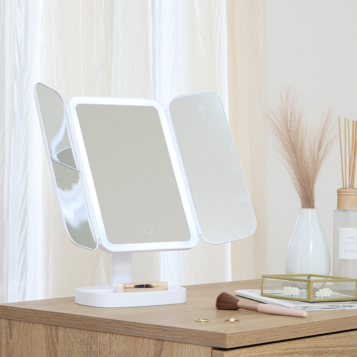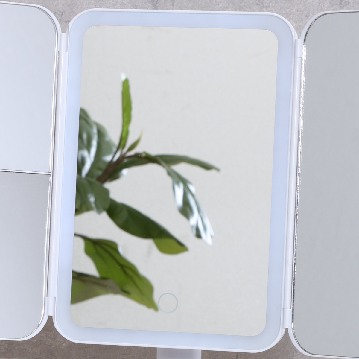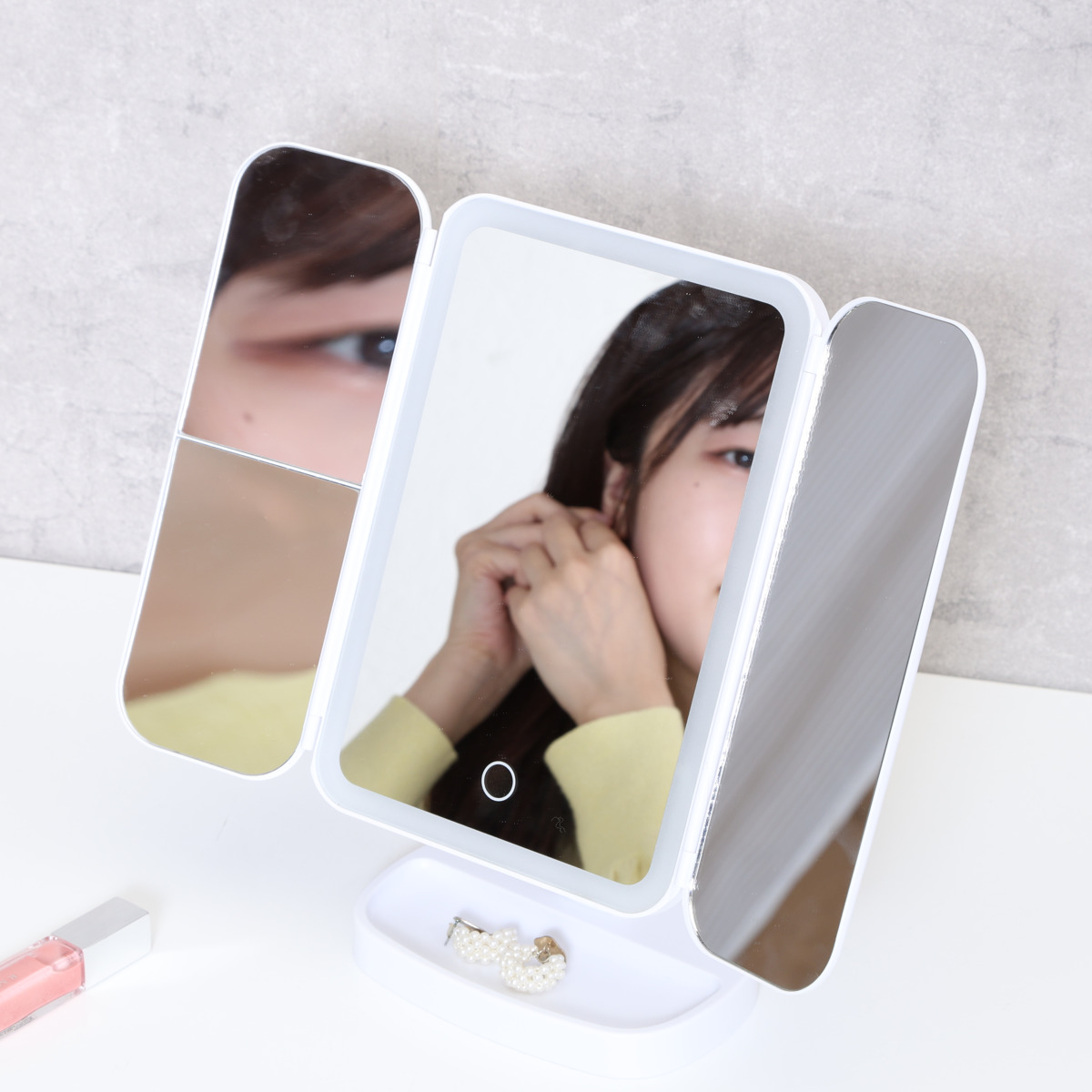 LEDライト付き三面鏡ミラー正面・左右の3面で、メイク中の横顔や細かな角度までしっかり確認できる卓上三面鏡ミラー。LEDライト付きで、明るさが足りない場所でも快適に身支度ができます。