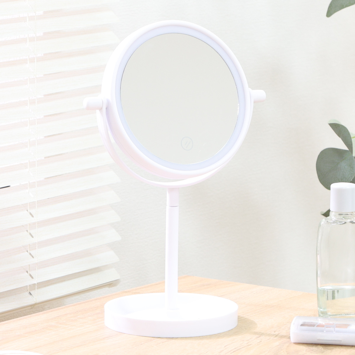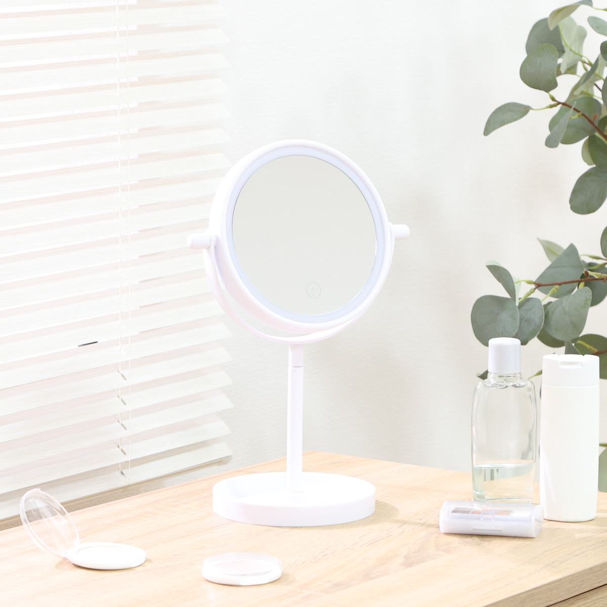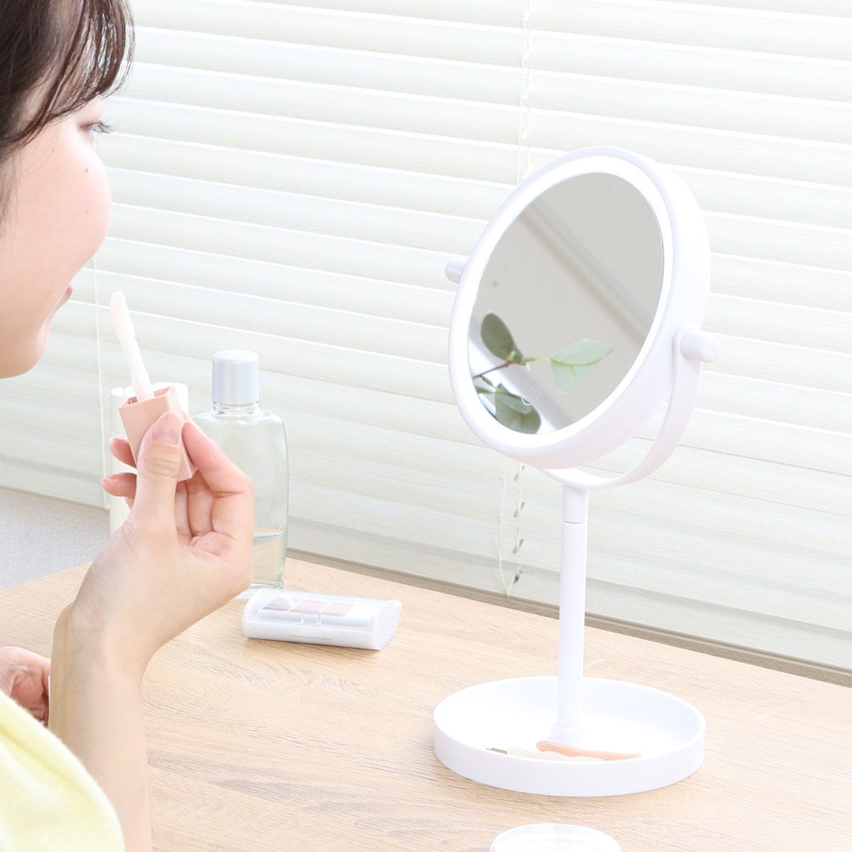 LEDライト付き卓上ラウンドミラーラウンド型のフォルムがやさしい印象の卓上LEDミラー。インテリアになじみやすく、毎日の身支度を心地よくサポートします。