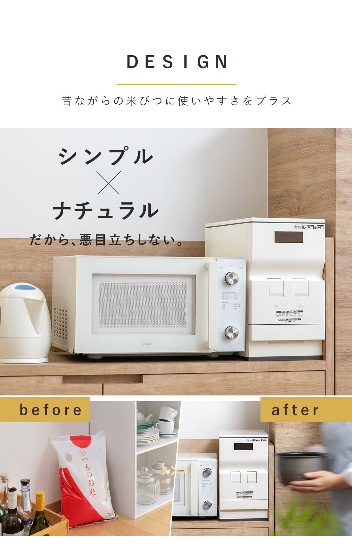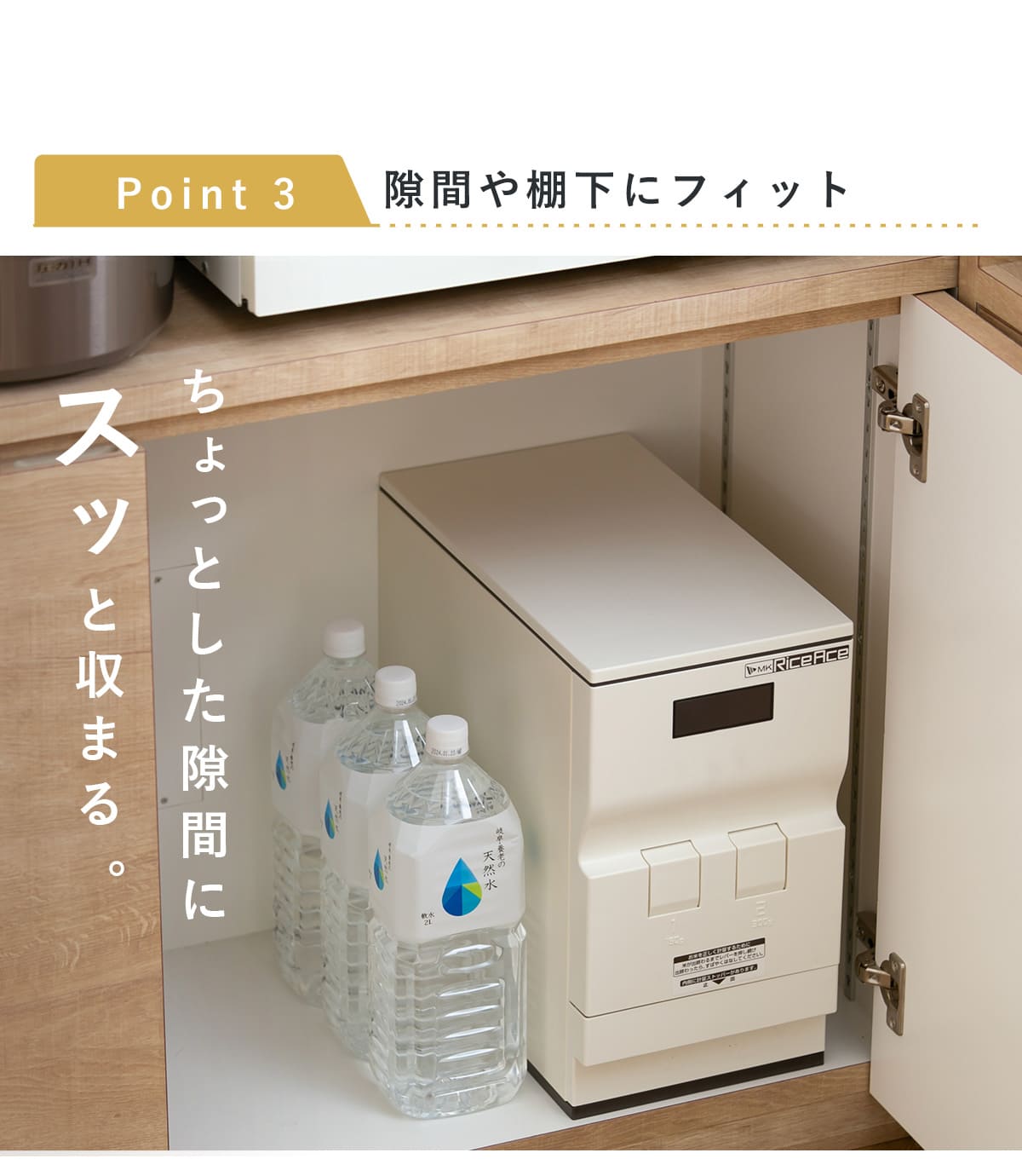 ●スリムタイプでシンク下や隙間にすっきり置ける計量米びつです。