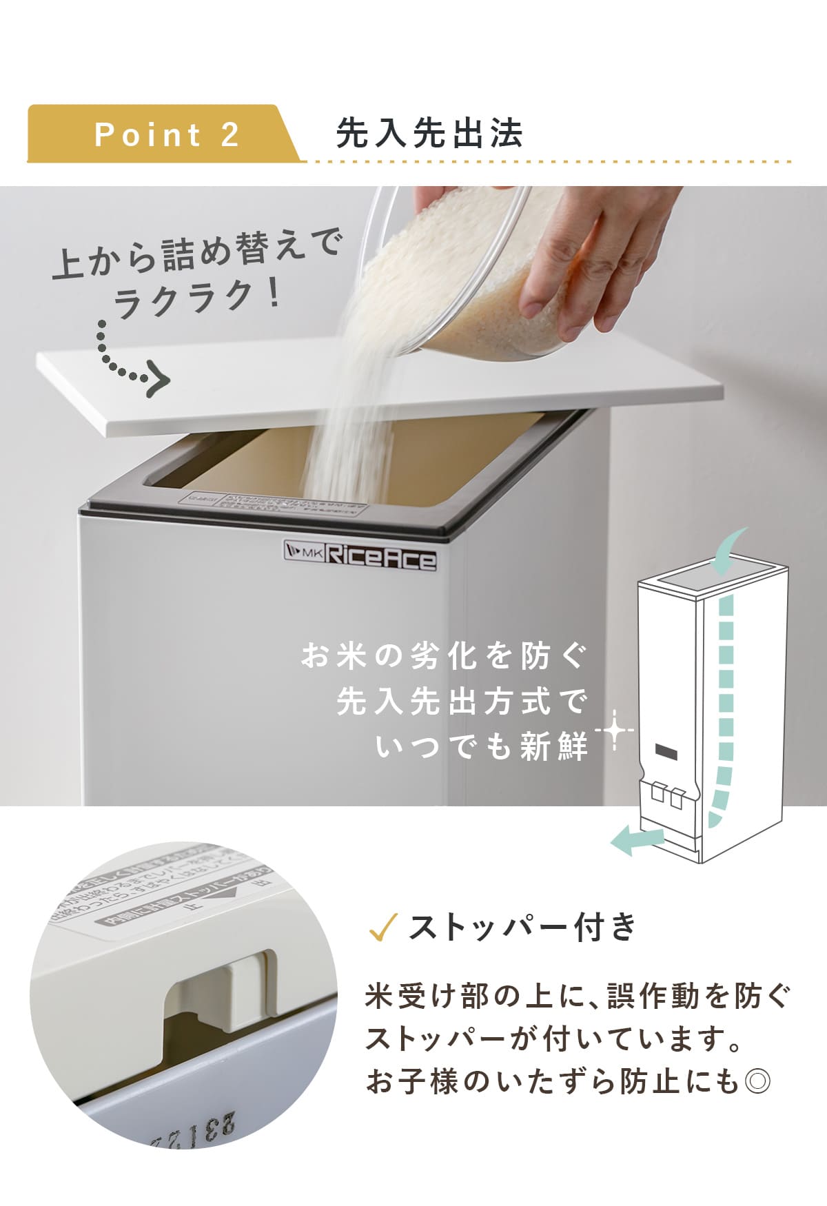 ●米受け部の上に子どものいたずらや誤作動を防ぐストッパー付きです。
