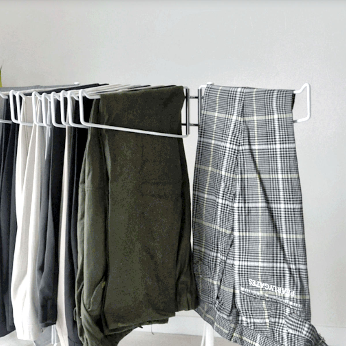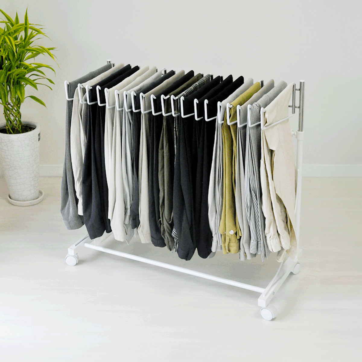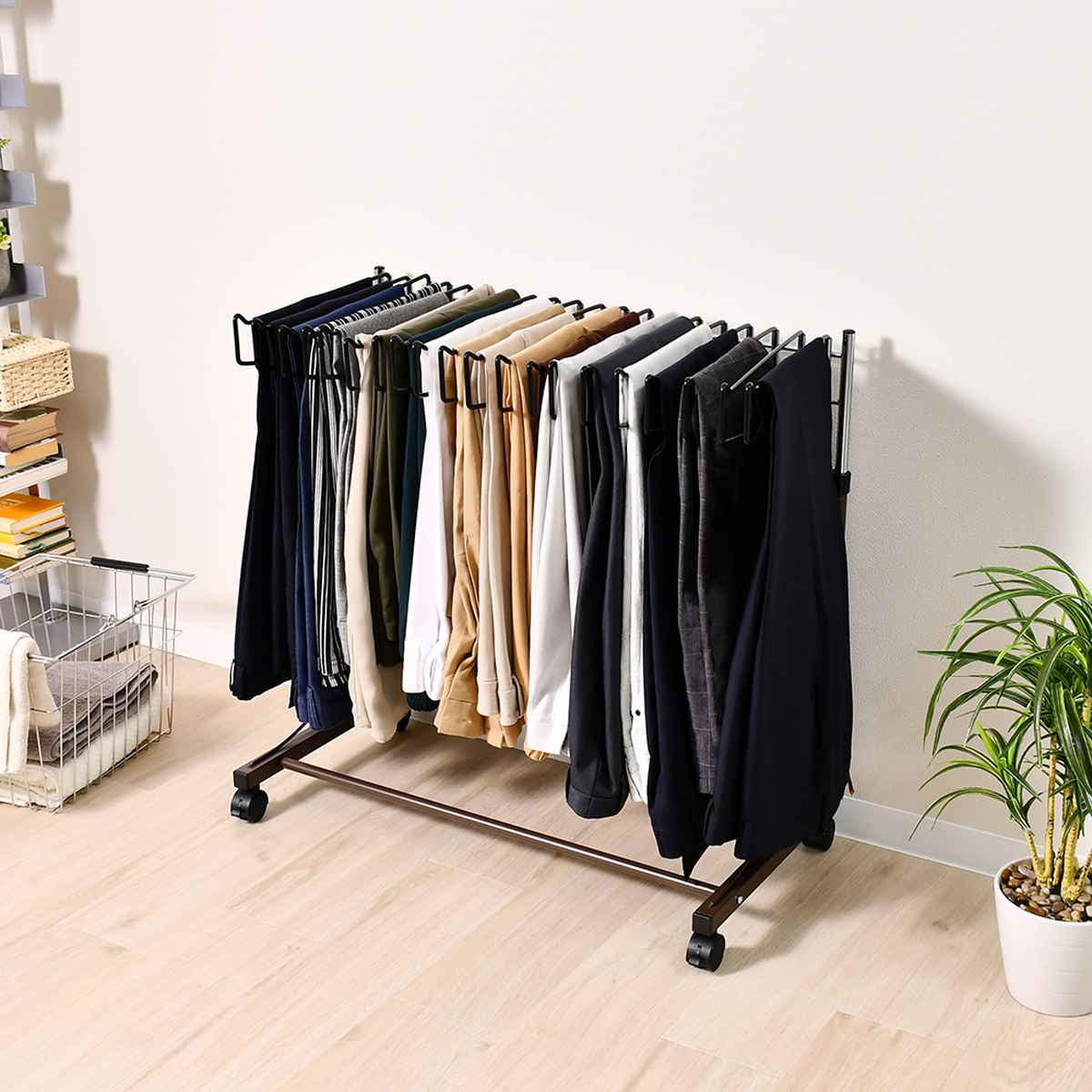 ワイドに開くスイング式ハンガーすべてのハンガーは左右に大きく開くスイング式を採用しています。お目当てのスラックスもひと目で確認でき、選びやすさ抜群です。履きたい一本がすぐに手に取れます。
