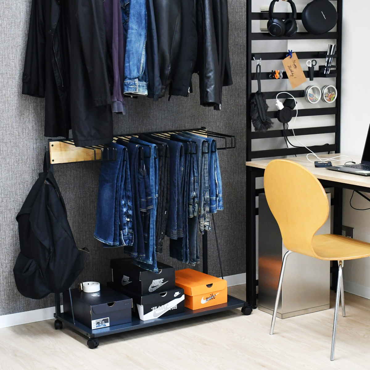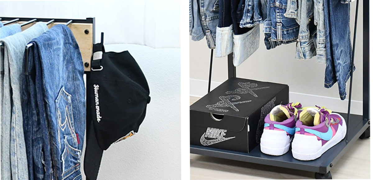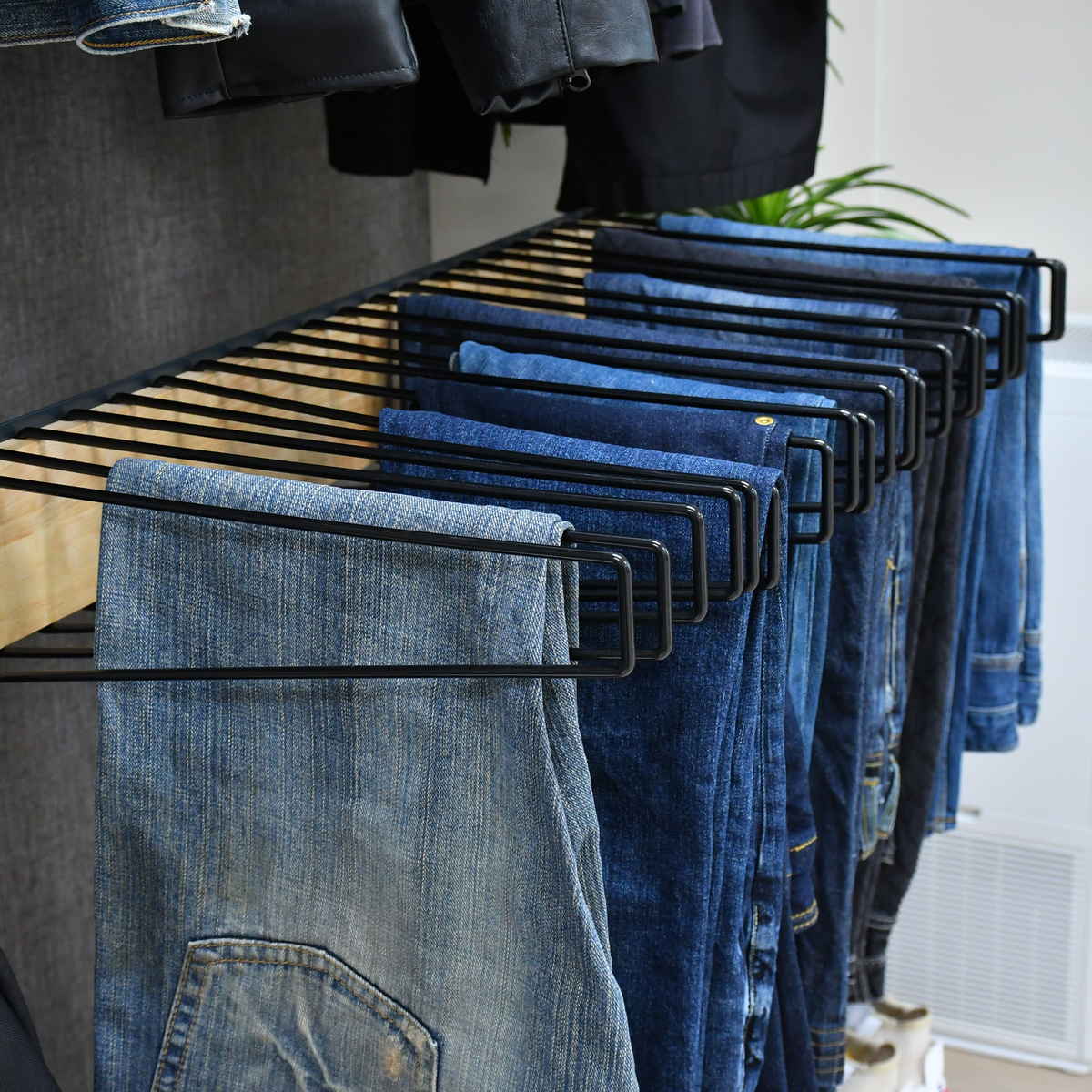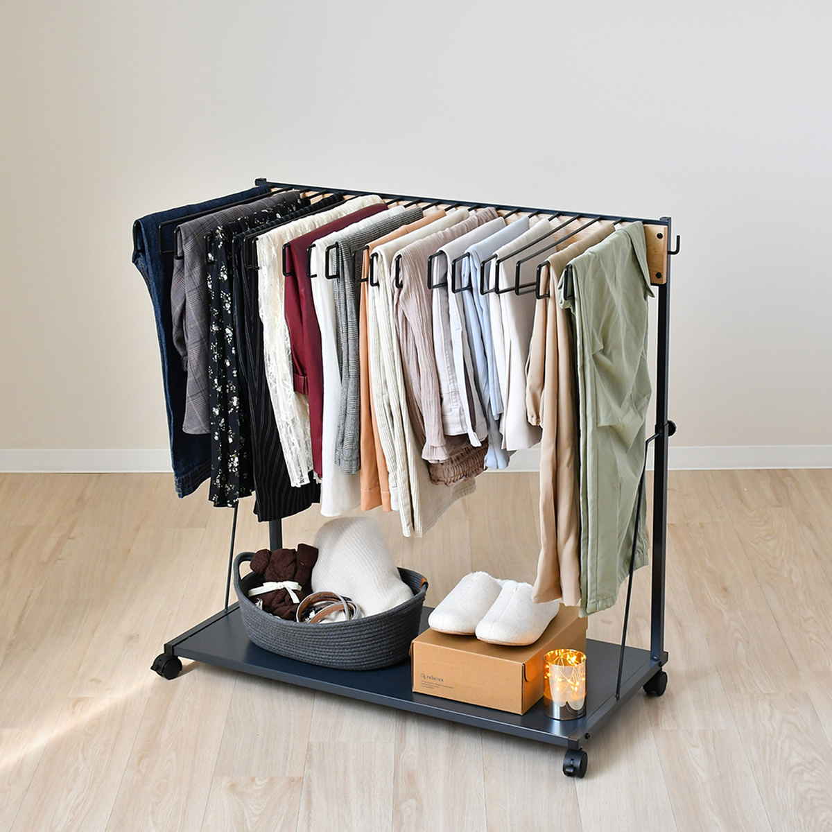幅広いアイテムに対応ジーンズはもちろん、スラックス・ワイドパンツ・スカート・タオル掛けとしても活躍します。1台で多用途に使える、頼れる収納インテリアです。