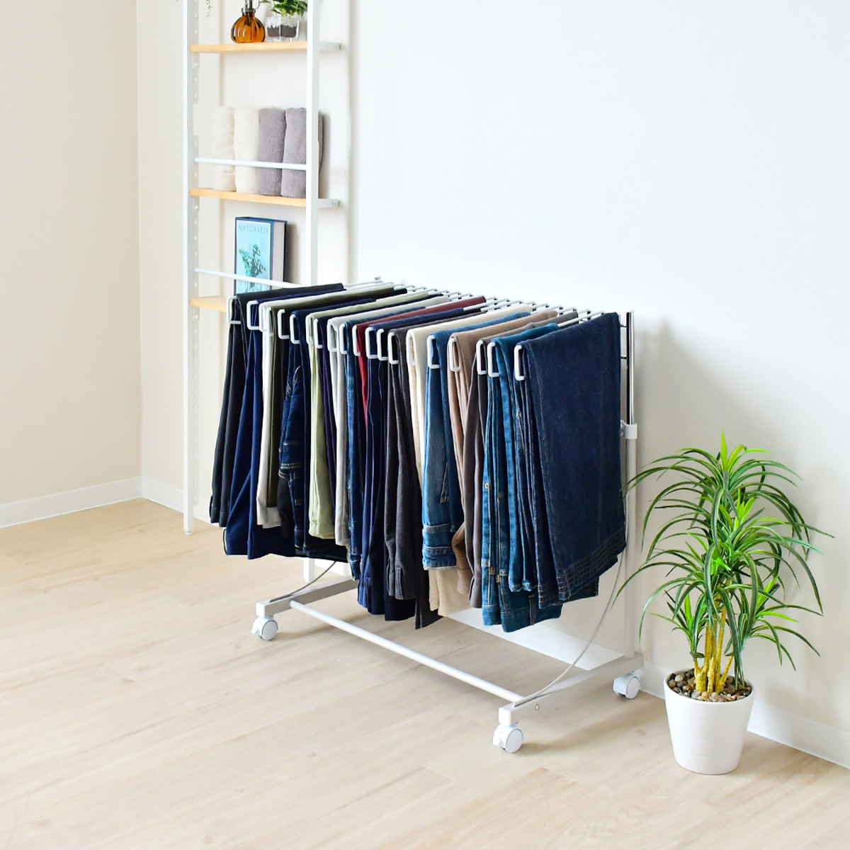 掛けるだけで、パンツ収納が整う伸縮式スラックスハンガー●スラックスを掛けるだけで収納できる、畳まない12本掛けスラックスハンガーです。