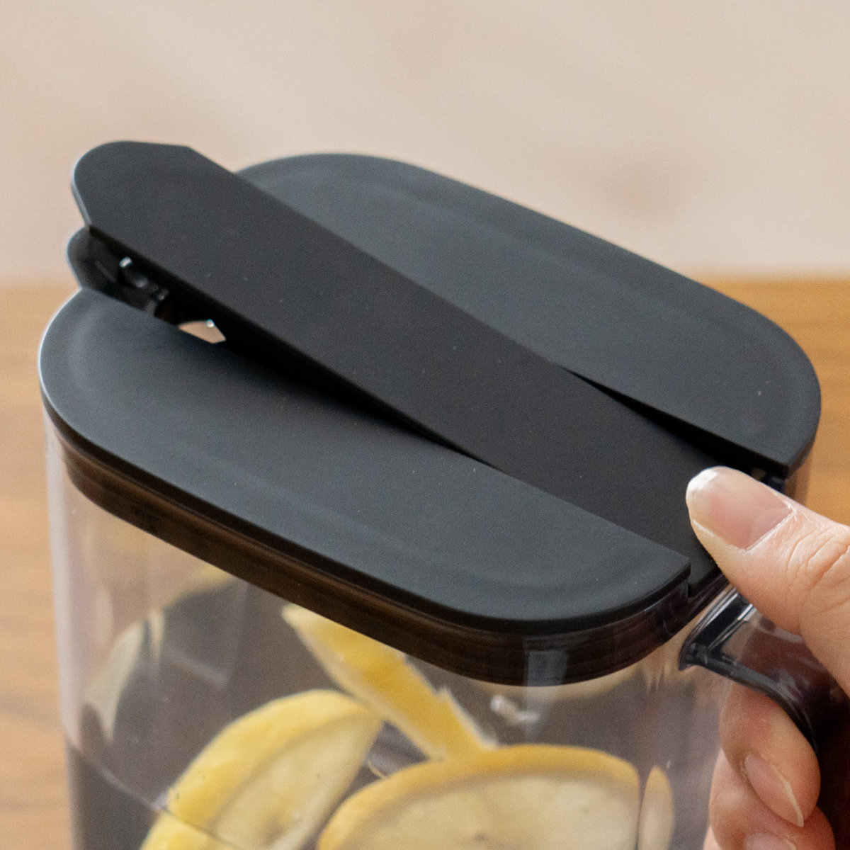 ワンプッシュで開閉簡単片手で簡単に開け閉めできるワンプッシュ式です。指4本がしっかり入る取っ手付きなので、冷蔵庫からの出し入れがしやすく、注ぎやすい設計です。