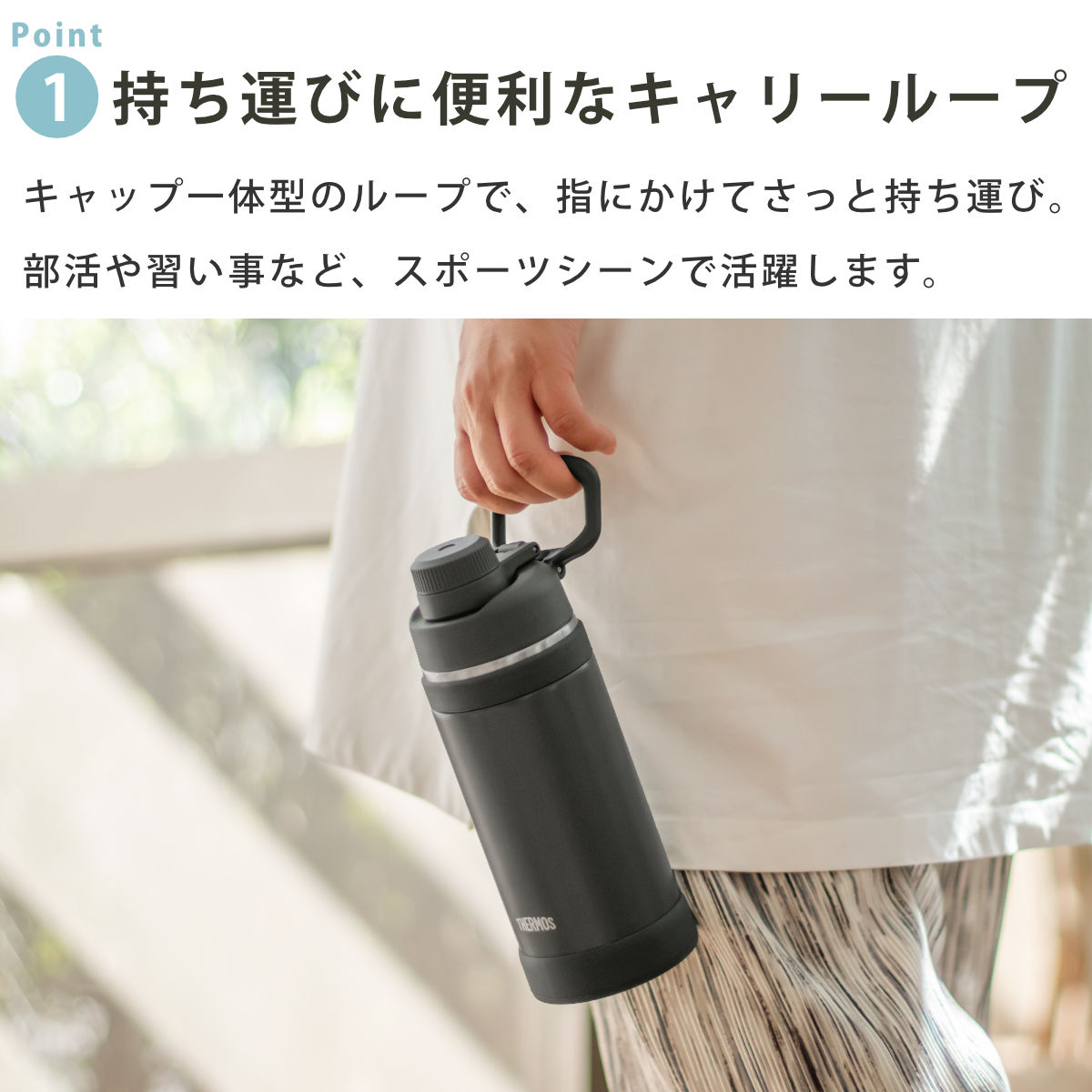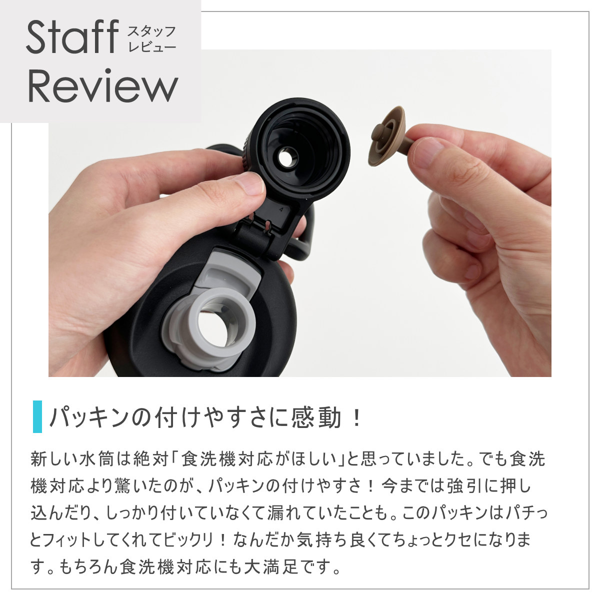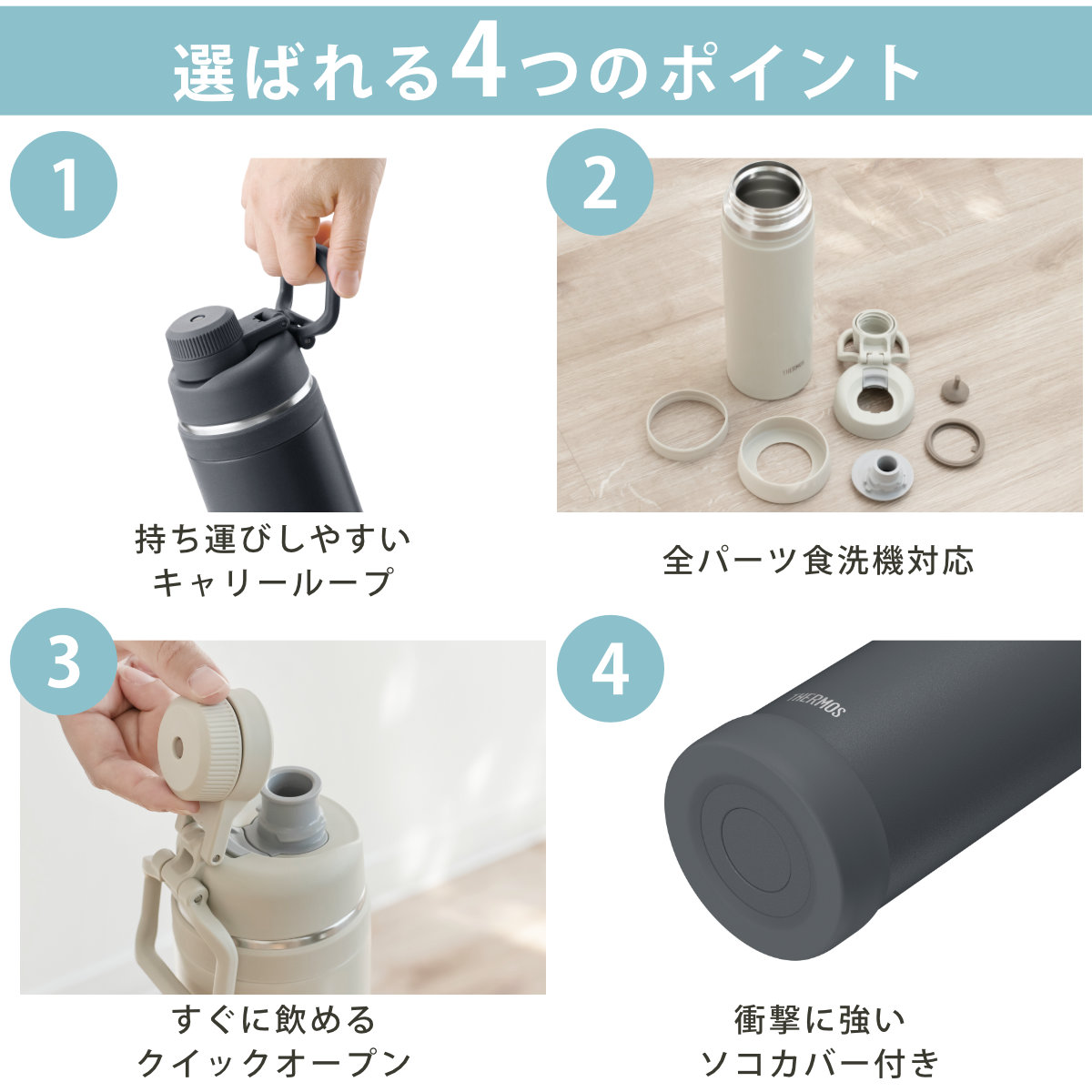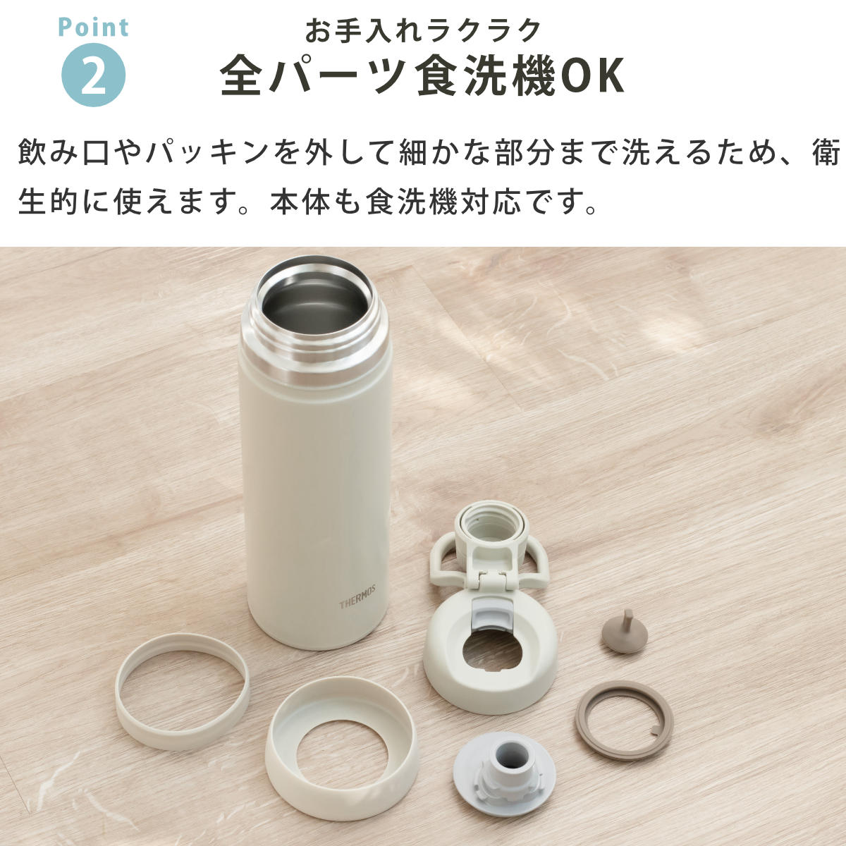 | 材質 | 内びん:ステンレス鋼 胴部:ステンレス鋼(アクリル樹脂塗装) 蓋、ループ、キャップ本体、飲み口:ポリプロピレン 蓋パッキン、シールパッキン、ボディリング、ソコカバー:シリコーンゴム |