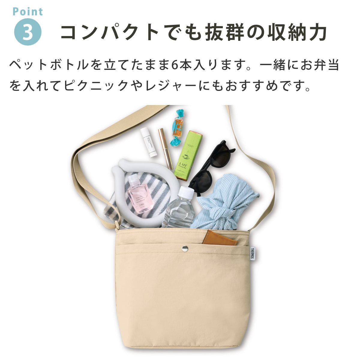 ●ペットボトルを6本入れることができる収納力で、ピクニックやレジャーにおすすめです。