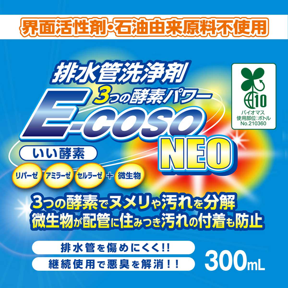 酵素×微生物で排水管をやさしく洗浄3つの酵素と微生物の力で、排水管内のヌメリや汚れを分解する排水管洗浄剤です。界面活性剤・石油由来原料不使用のため、排水管を傷めにくく、安心してお使いいただけます。洗面台、台所、浴室の排水口に使用できます。