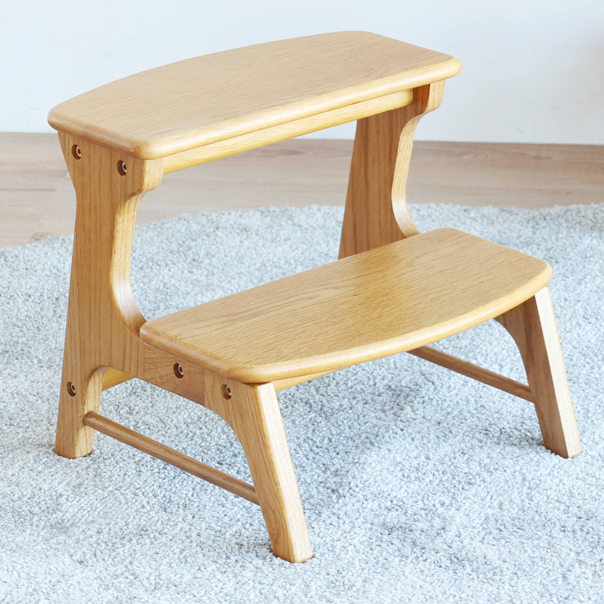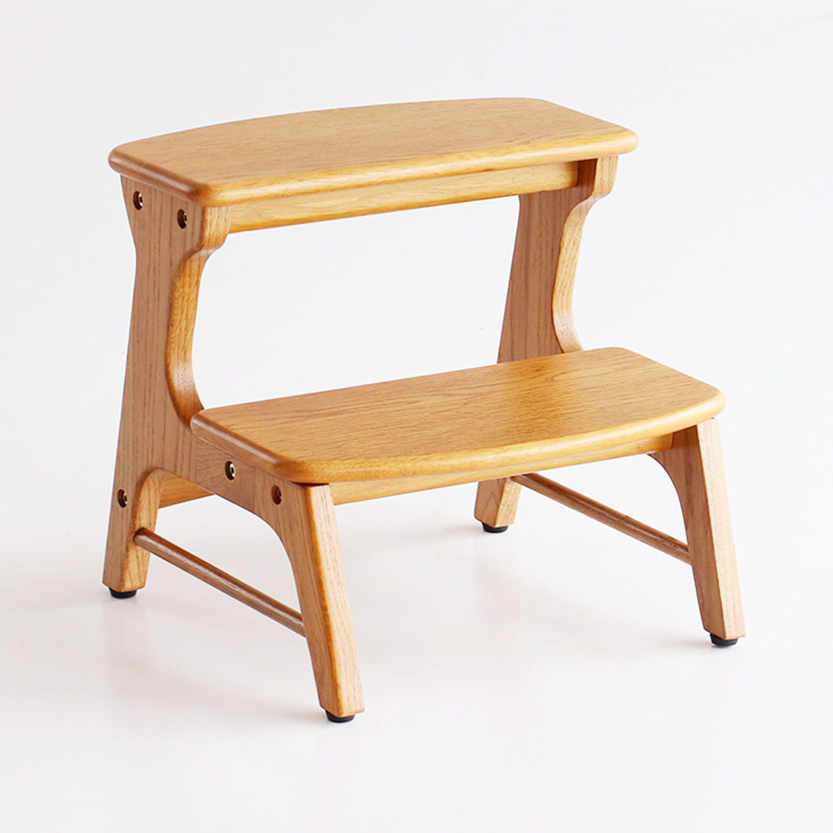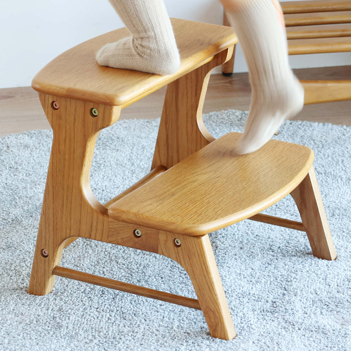 フレームにはオーク無垢材、踏板にはオーク突板を使用したキッズステップです。木肌のやさしい手ざわりと、美しい木目が際立つ仕上がりです。天然木ならではのあたたかみが、空間に自然と溶け込みます。
