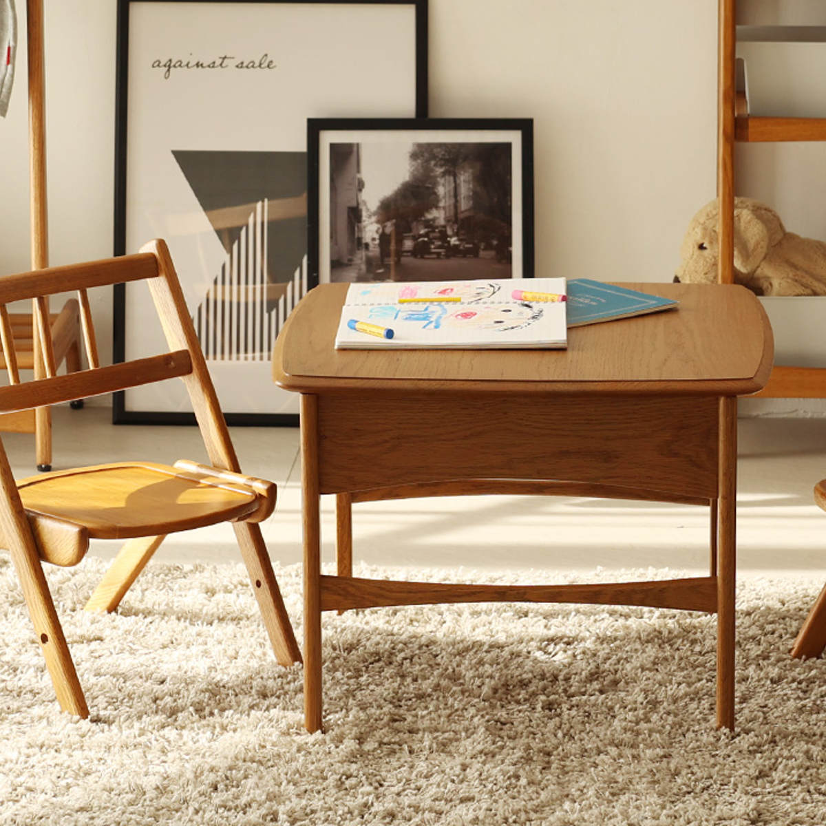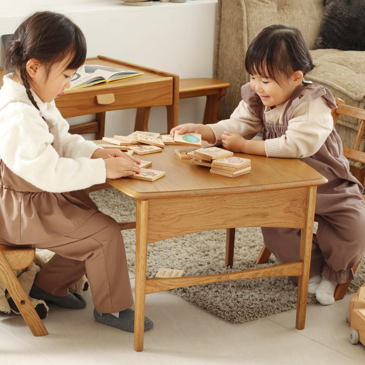 天板や脚部にはオーク無垢材を贅沢に使用した折りたたみ式学習机です。使うほどに味わいが深まる天然木の風合いが、お子さまの暮らしにやさしく寄り添います。