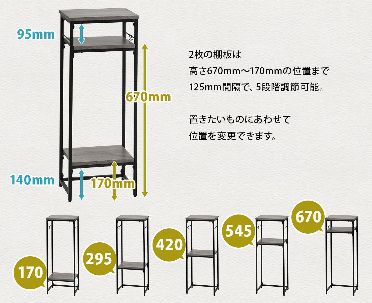 2枚の棚板は高さ67〜17cmの位置まで、12.5cm間隔で5段階調節が可能です。1段階空きで小物やスマホを置いたり、2段階置きで本を収納したりと、用途に合わせて自分好みにアレンジできます。