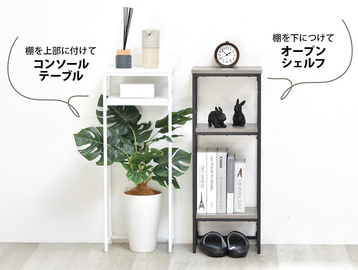 玄関や廊下など、広さが限られたスペースでも設置可能な幅30cmのコンソールテーブルです。リビングでディスプレイラックとして、キッチンのストック収納として、トイレなどの狭い場所でもマルチに使えます。