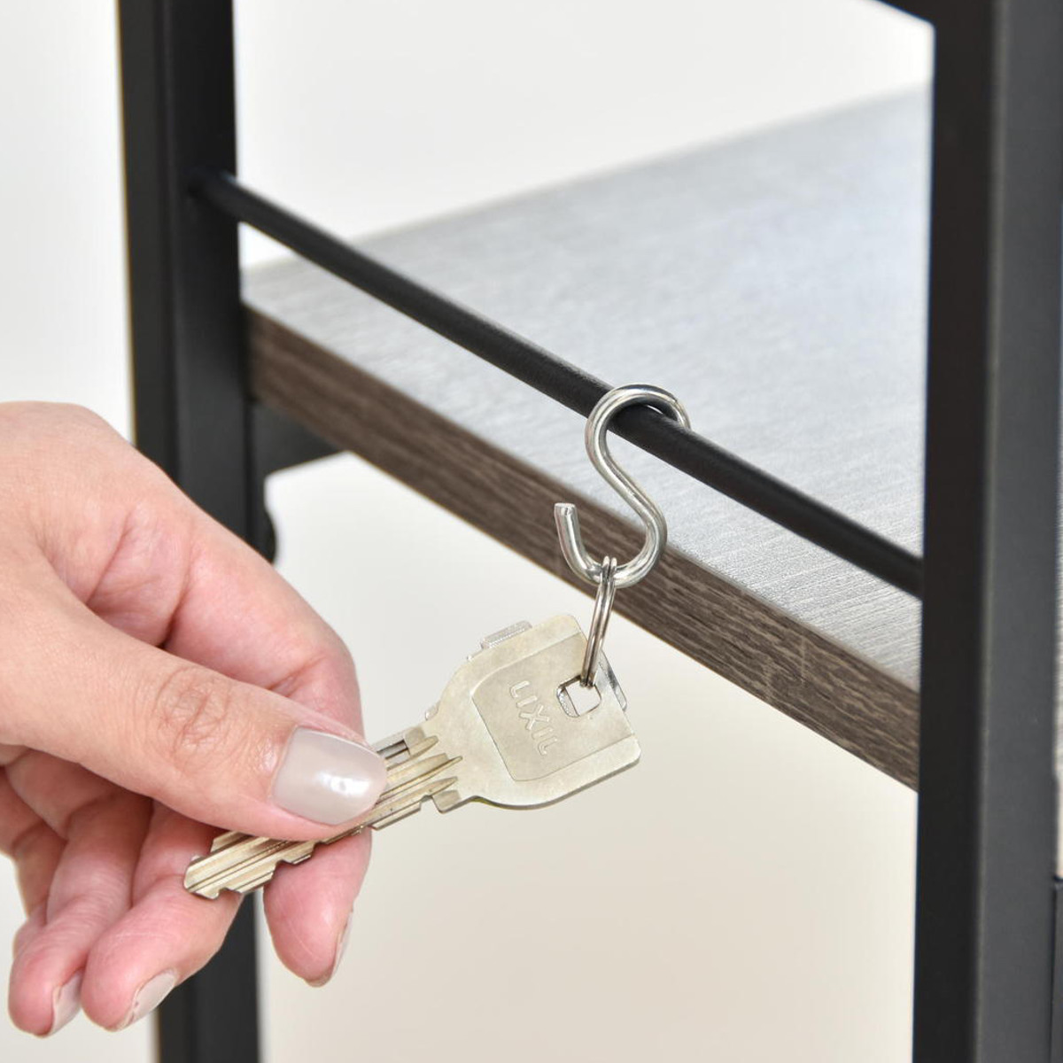 フレームに掛けられるS字フックが2個付属しており、鍵やマスクなどをかけておくことができます。折り畳み傘や靴べら、エコバッグなどの収納におすすめです。
