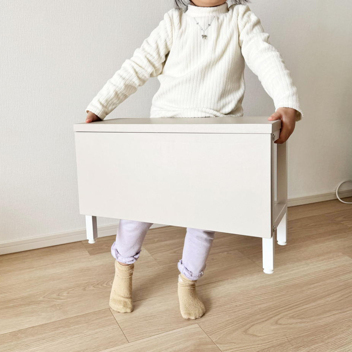 小さな子どもが座って靴を履きやすい高さで、バランスを崩さず靴の履き替えができます。天板下に靴を収納できるので、狭い玄関にも置きやすいです。