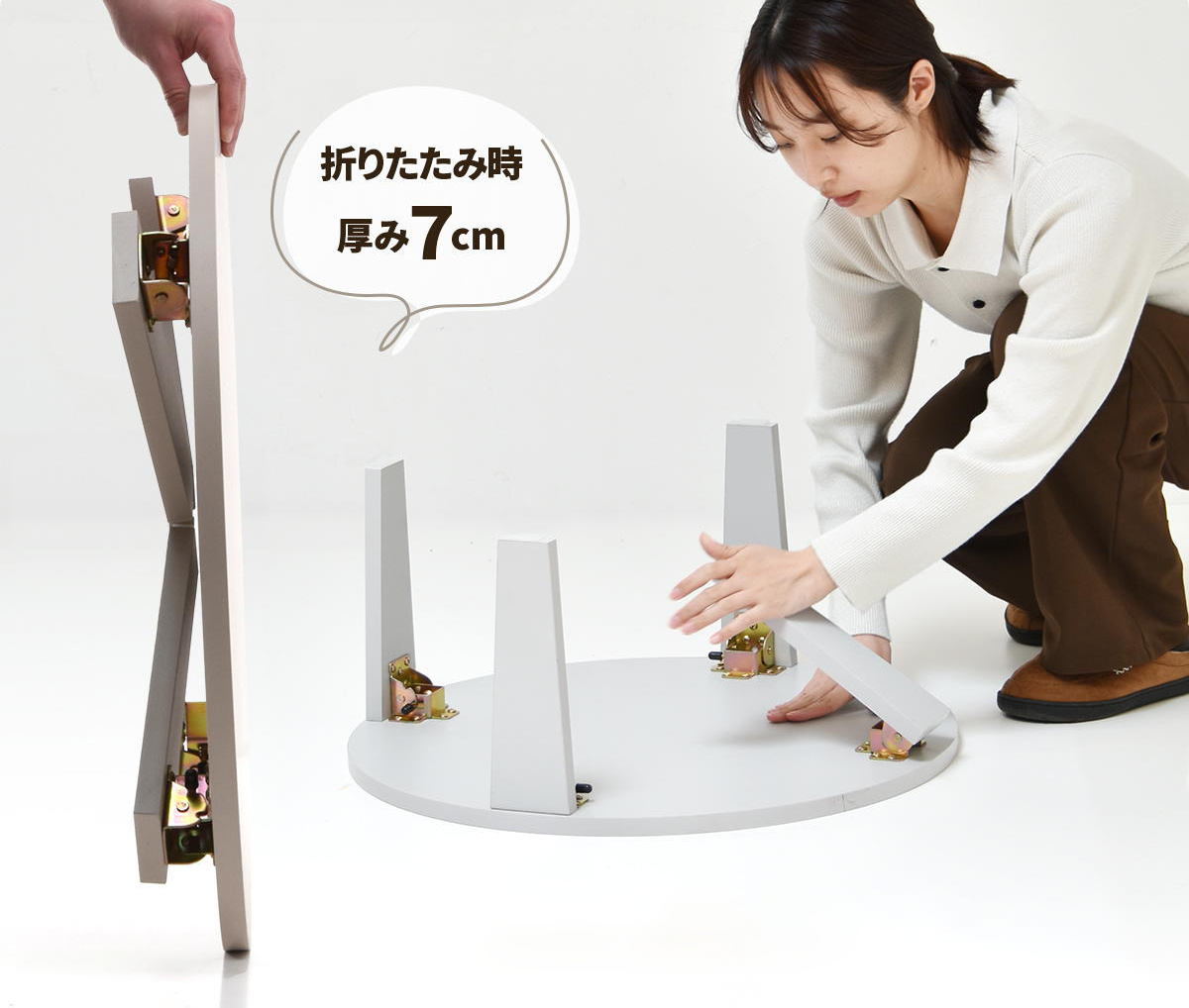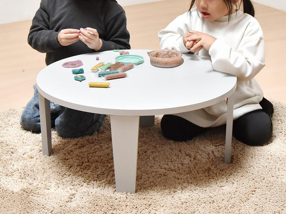 直径60cmなのでどこにでもちょこんと置けて、食事やPC作業、家事のサポートなど様々なシーンで活躍します。通常のテーブルよりも少し低めの設計なので、資料が見やすいのもポイントです。