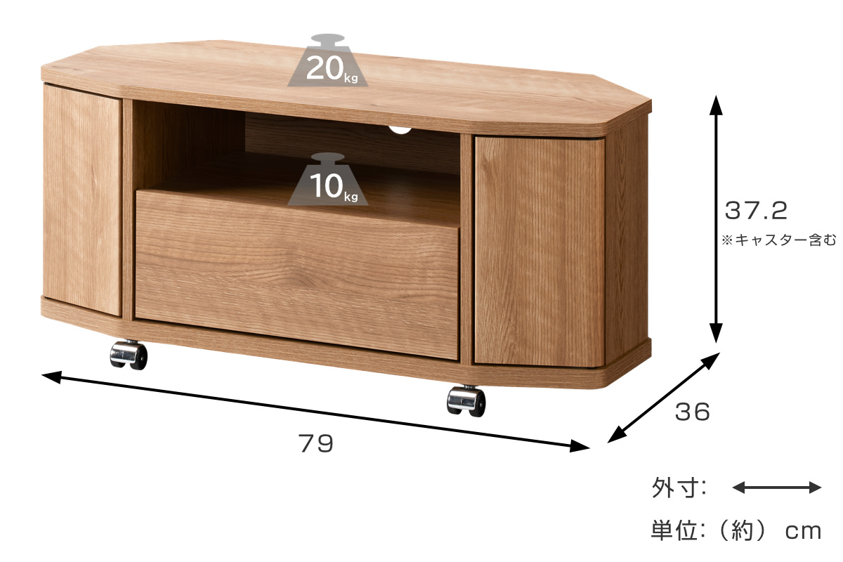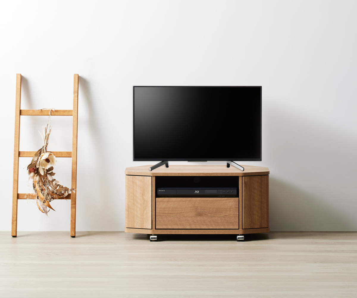 角までムダなく使えるコーナーテレビ台 幅79cmお部屋の角のデッドスペースを有効活用できる、コーナータイプのテレビ台です。もちろん壁に沿って正面置きも可能。レイアウトに合わせて自由に設置できます。幅79cmのコンパクト設計で、ひとり暮らしのお部屋やセカンドテレビ用にもおすすめです。
