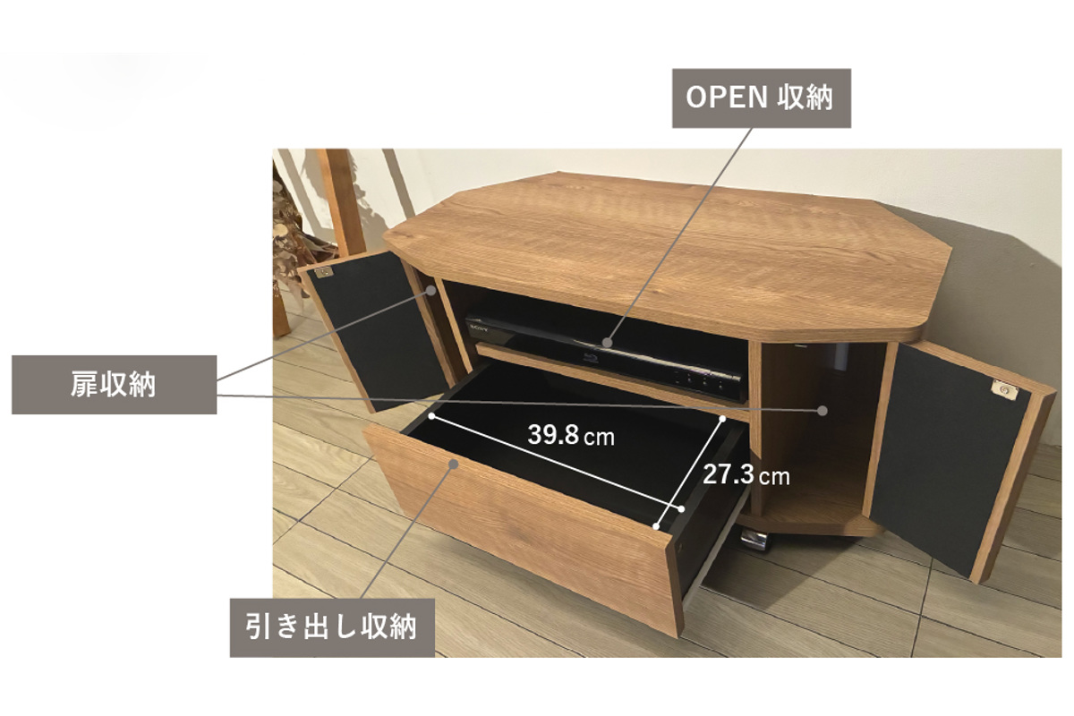スライドレール仕様でスムーズに開閉できます。リモコンや説明書など、テレビまわりの小物整理に便利です。