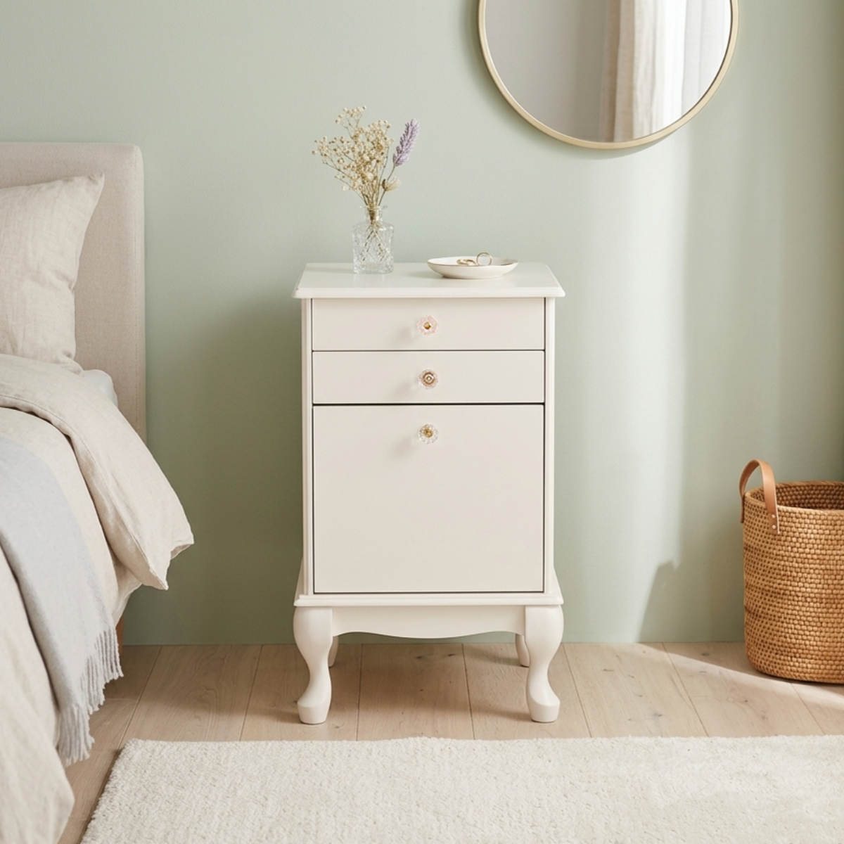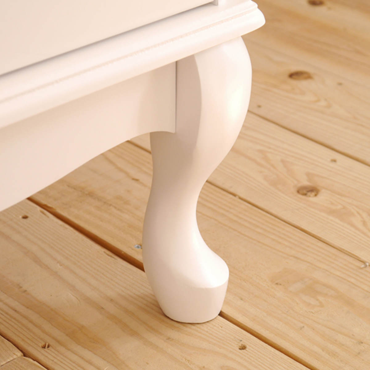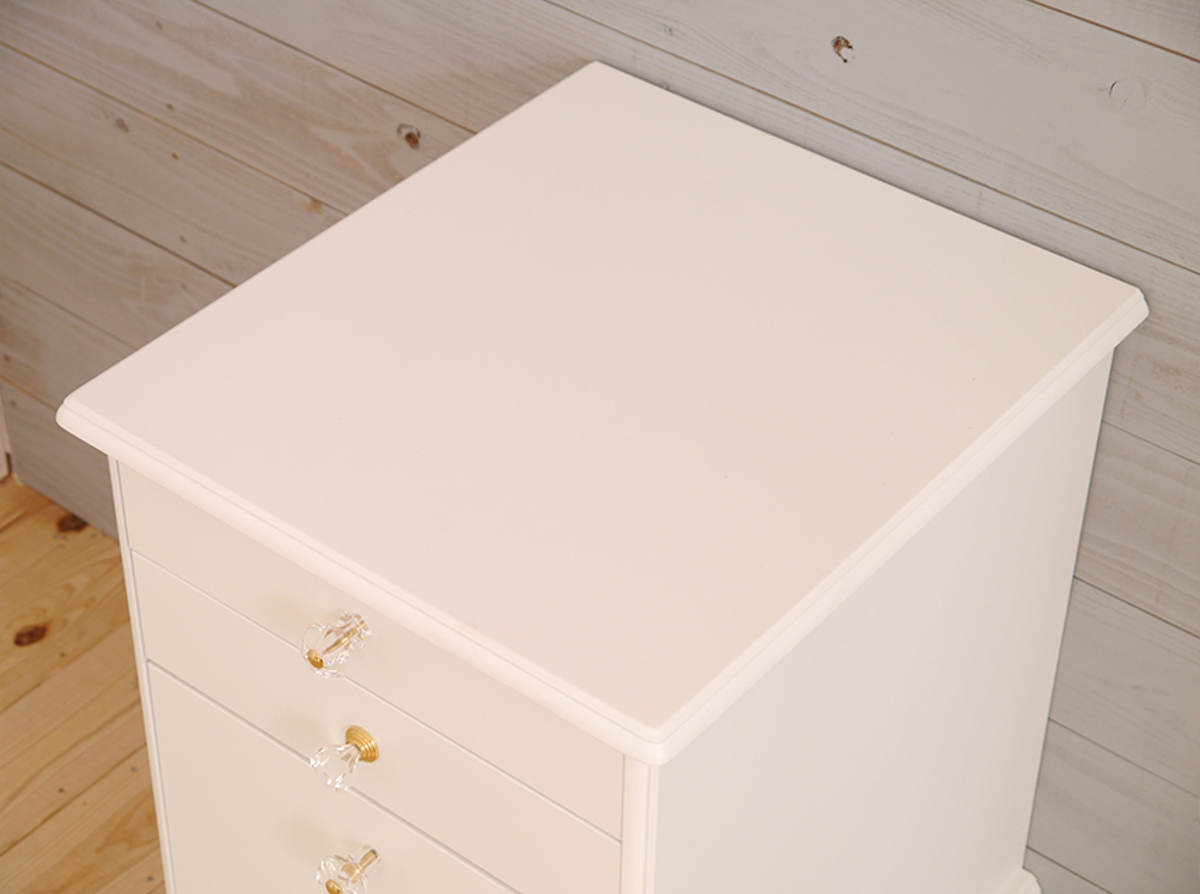 上品で優しい印象のサイドチェストです。小ぶりなサイズ感と猫脚が愛らしく、大人の女性でも使いやすいデザインです。フラットな天板なので、ベッドやソファサイドでナイトテーブルとしてもお使いいただけます。