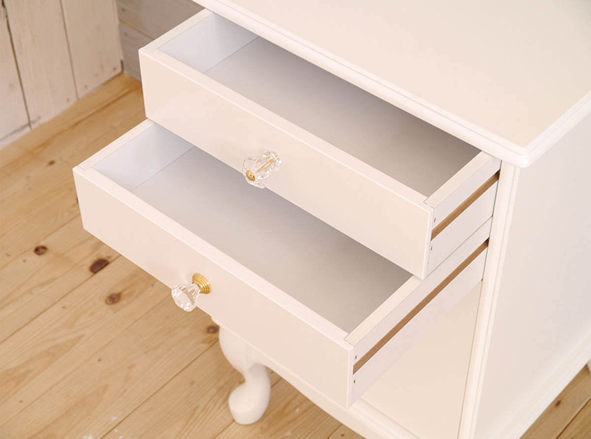 引出しの取っ手には3種類のキラキラのクリスタル風取っ手を採用。シンプルながらも存在感があり、お部屋のアクセントとしても映えるデザインです。