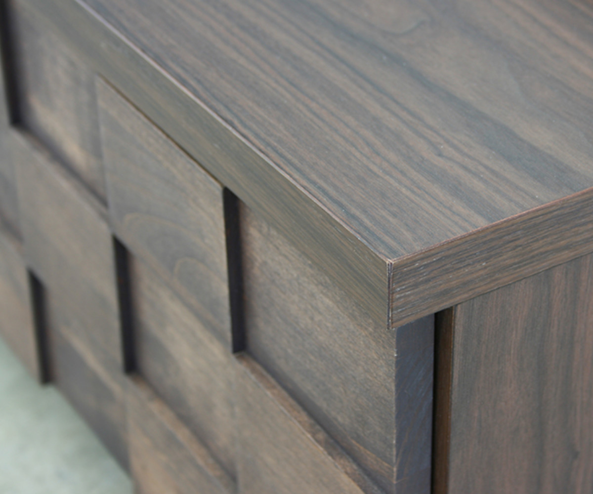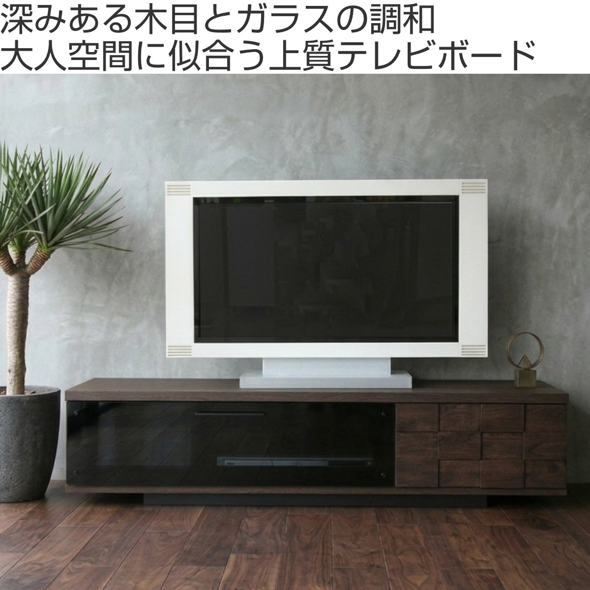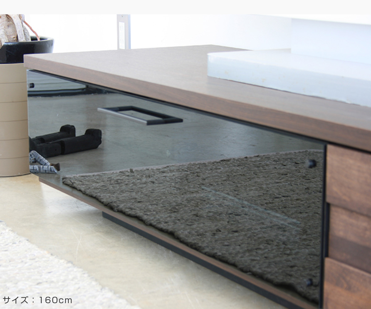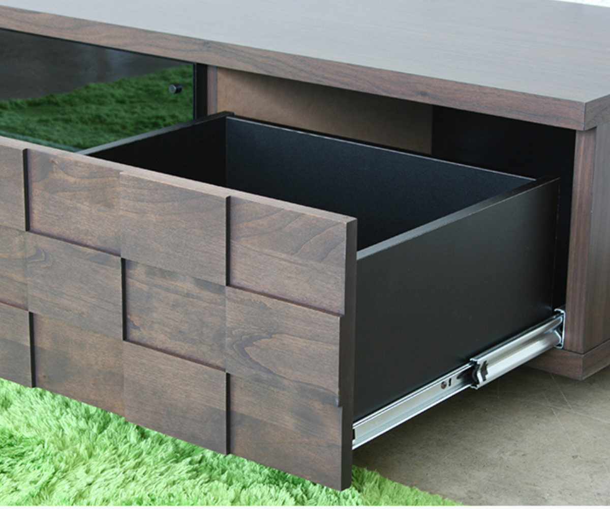 | 材質 | 天板:強化紙 引出し前板:アルダー無垢材(オイル塗装) ガラス扉:4mm厚強化ダークグレーガラス 側面・内装:プリント紙 引き手:スチール |