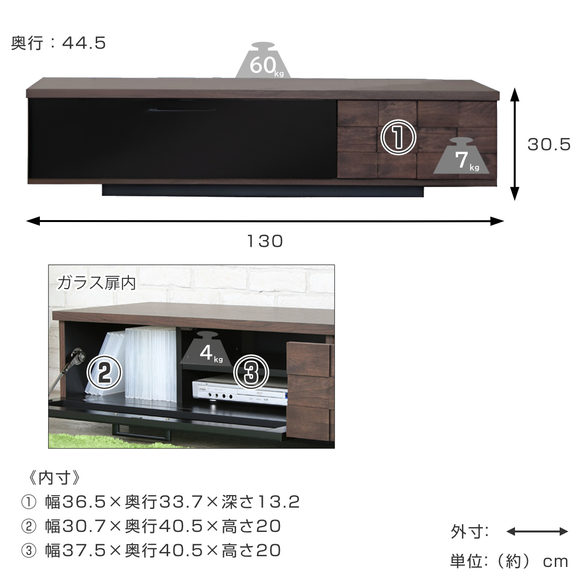 | サイズ | 約 幅130×奥行44.5×高さ30.5(cm) |