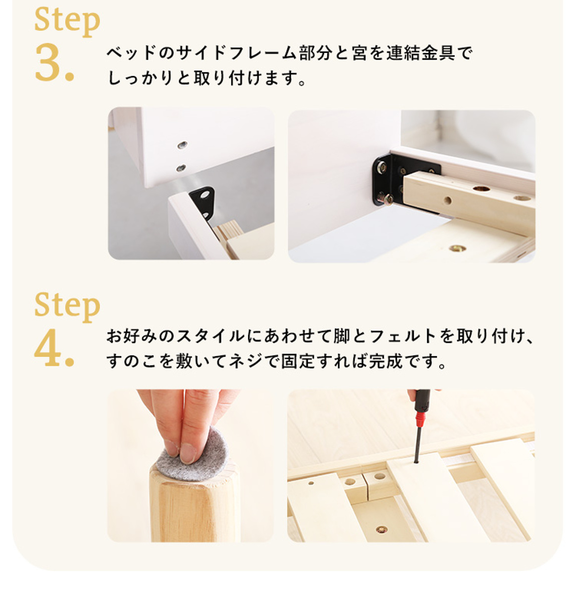 | 材質 | 本体:天然木(パイン材) すのこ:合板(LVL) 表面材:ラッカー塗装(ホワイトウォッシュ、ブラウン)、無塗装(ナチュラル) |