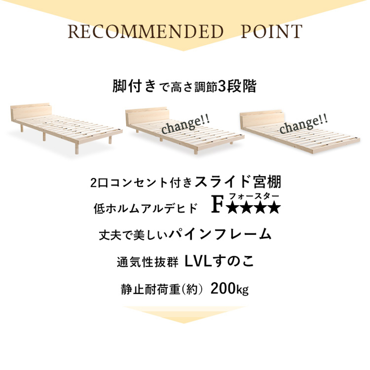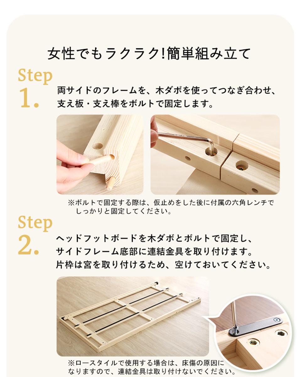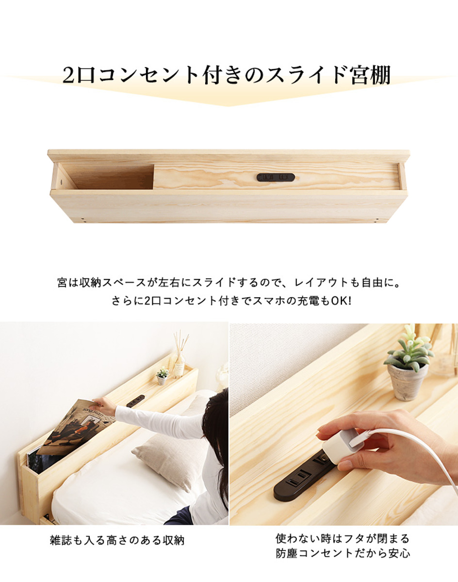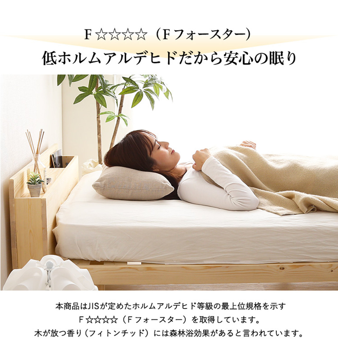 | 備考 | ホルムアルデヒド放散区分:F☆☆☆☆ 2口コンセント付き ベッド組立時間:30分 |