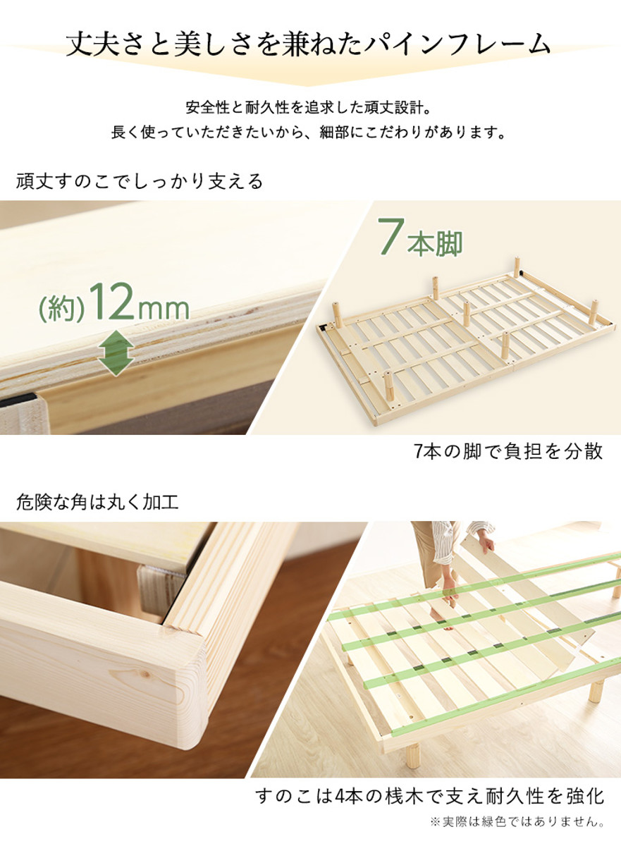 | 材質 | 本体:天然木(パイン材) すのこ:合板(LVL) 表面材:ラッカー塗装(ホワイトウォッシュ、ブラウン)、無塗装(ナチュラル) |