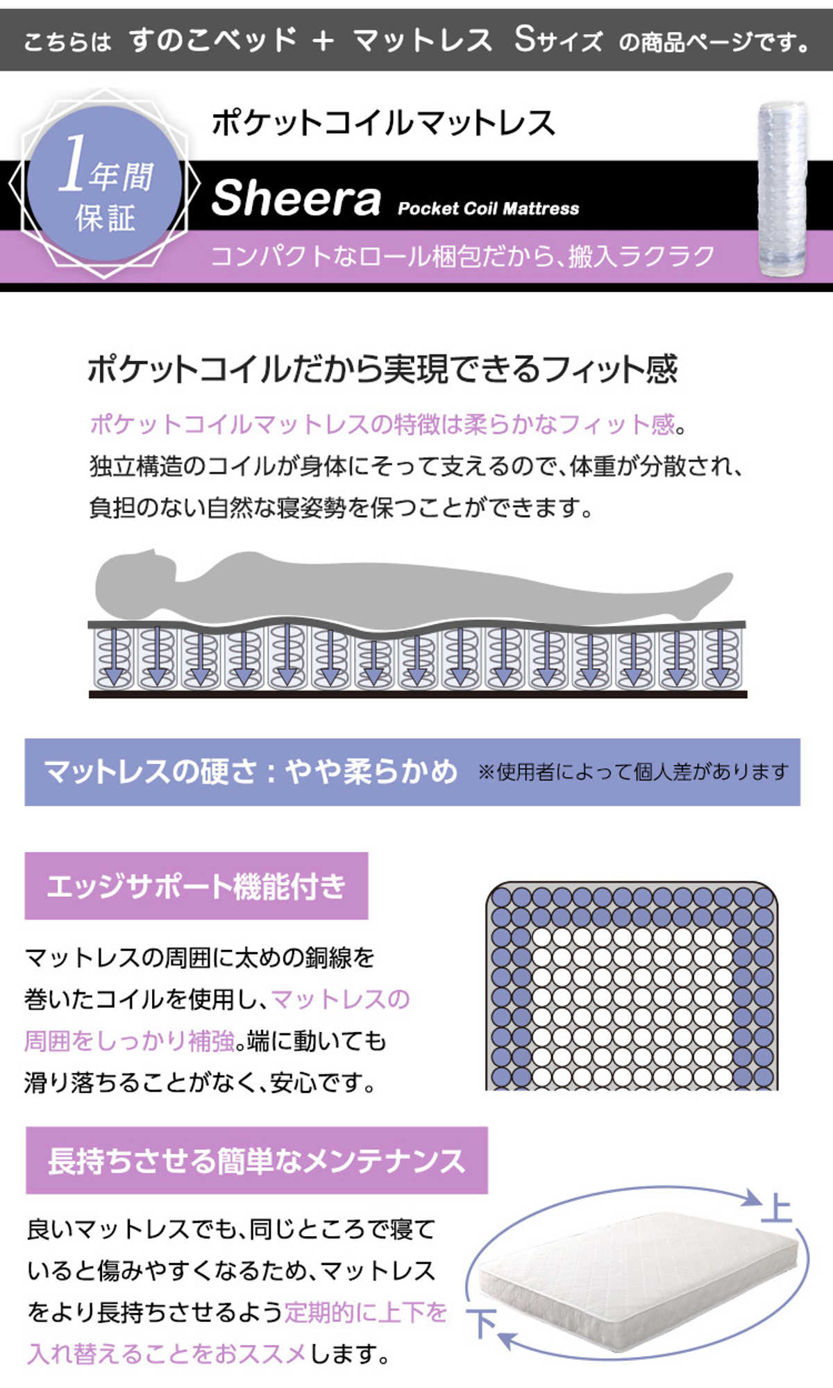 | 梱包サイズ | ベッド:約 幅100×奥行26×高さ20.5(cm) マットレス:約 幅28×奥行28×高さ102(cm) |
