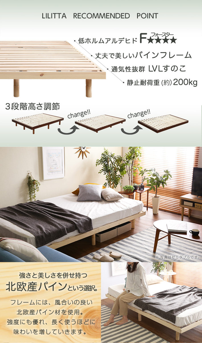 | 材質 | 【ベッド】 本体:天然木(パイン材) すのこ:合板(LVL) 表面材:ラッカー塗装(ホワイトウォッシュ、ブラウン)、無塗装(ナチュラル) 【マットレス】 張り材:ポリエステル100% クッション材:ポケットコイル、ウレタンフォーム、不織布 |