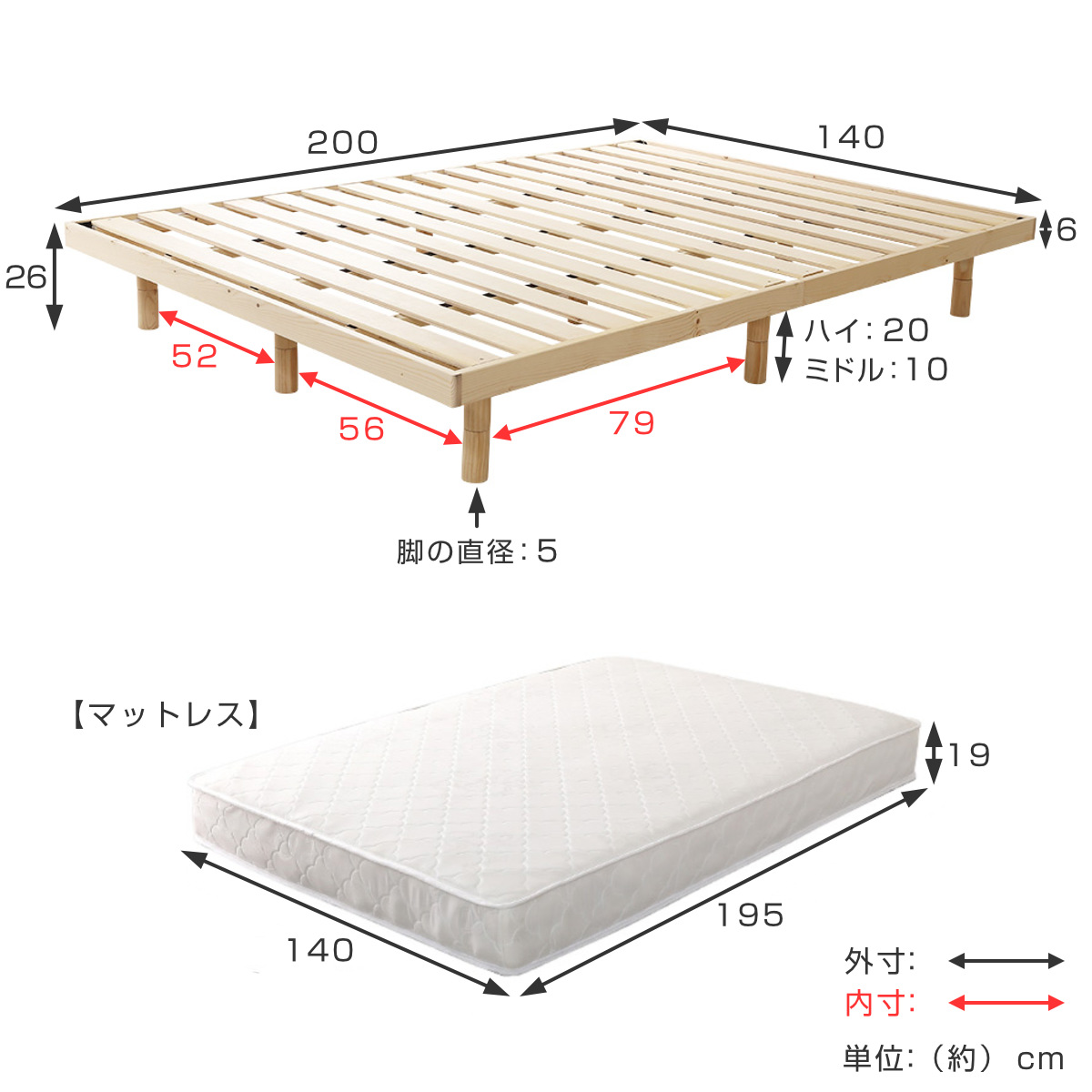 | サイズ | ベッド:約 幅140×奥行200×高さ6/16/26(cm) マットレス:約 幅140×奥行195×高さ19(cm) |
