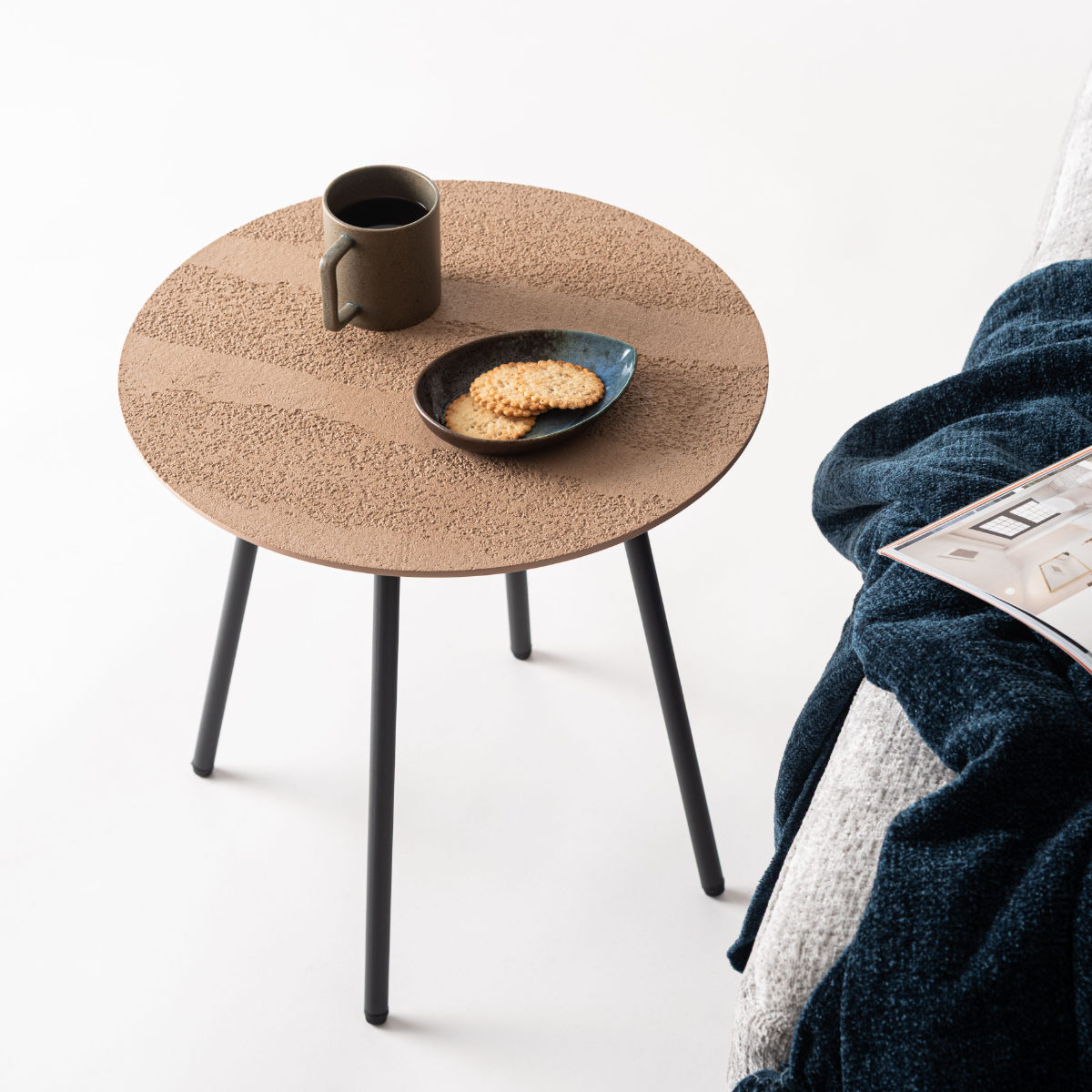 表情豊かなコンクリート調デザイン凹凸のあるコンクリート調の天板が印象的な、シックでモダンなサイドテーブル。立体感のあるデザインが空間にさりげないアクセントを加え、シンプルなお部屋にも奥行きのあるスタイリッシュな雰囲気を演出します。※天板の柄や風合いには個体差があります。