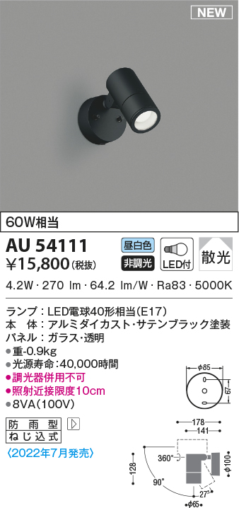 AU54111 エクステリア スポットライト 60W相当 昼白色 LEDランプ交換可能型 非調光 防雨型 ブラック