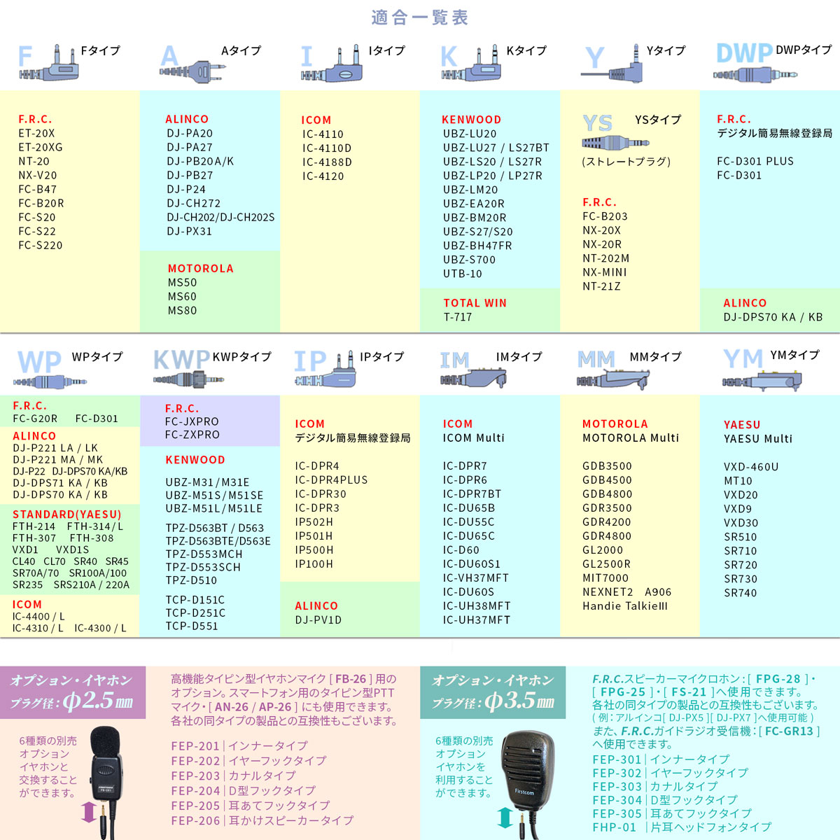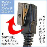 衣類の襟元などにクリップで装着し、手動で送信が可能。 Fタイプ…*F.R.C.対応[2pin] Kタイプ…KENWOOD対応 Aタイプ…ALINCO対応 Iタイプ…ICOM対応 YS / Yタイプ…*F.R.C.対応[1pin]ストレート/L字プラグ WPタイプ…各社防水ジャック対応 KWPタイプ…KENWOOD[1pin]対応 IMタイプ…ICOM Multi対応 MMタイプ…MOTOROLA Multi対応 YMタイプ…YAESU Multi対応 IPタイプ…ICOMデジタル簡易無線登録局対応:IC-DPR30 / IC-DPR3 / IP-500H / IP-501H / IP-100H