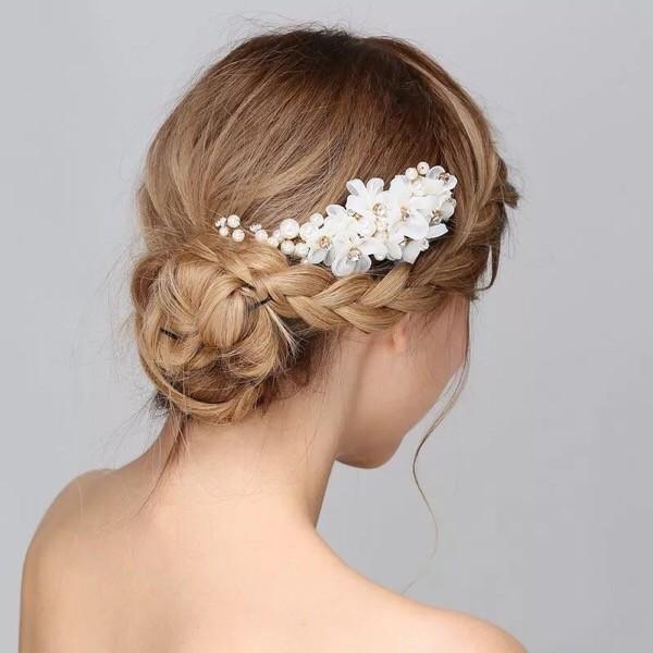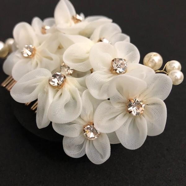 ハンドメイドフラワーとラインストーンを1つ1つ丁寧に繋いだフラワーコーム。