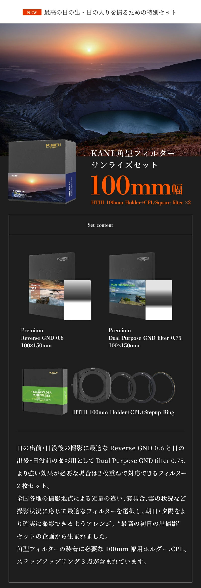 撮影地や季節・天候によって最適なフィルターは厳密には異なりますので、本製品を使いこなすことを通じて得られた経験をもとに、グラデーション幅や濃度が違う各種GNDフィルター(ソフト・ミディアム・ハード・リバース・センター)なども併せてご検討ください。