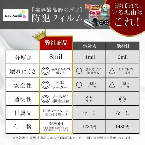 【強固な4層フィルム構造で窓破りを防ぐ】先進の製造技術により各層がしっかりと融合し、耐傷コーティングを施すことで表面の傷に強くなっています。さらに、酸化防止層を備えた高品質の厚型PETを主体材質として採用し、材質の靭性を高める防爆強化処理を行っています。