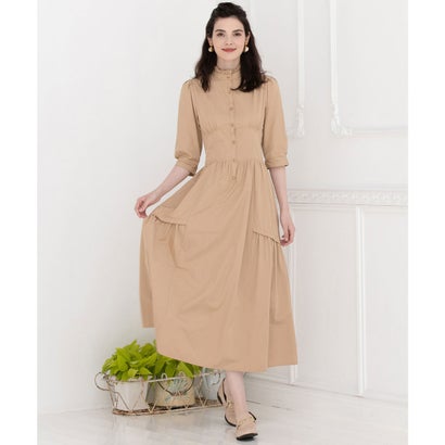 フリルのスタンドカラーやコルセットライクなウエスト切り替えがクラシカルな印象に。