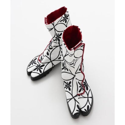 面ファスナー付きで着脱しやすい地下足袋。軽量で柔軟、地面に自然な形でフィットする地下足袋は、昔から祭りなどで使われてきました。七宝は「円満」や「調和」を意味する縁起柄。七宝に花をあしらった華やかさのあるデザイン。