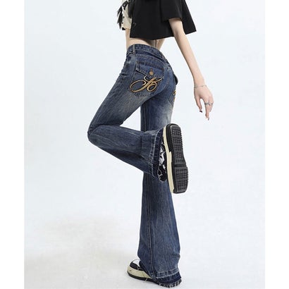 レトロ風ブーツカットデニム美脚脚長 ローライズベルボトム 足長見え カジュアルパンツバックポケット ワンポイント刺しゅう