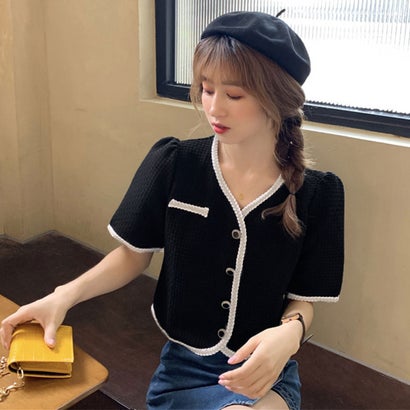 レトロボタンお洒落 配色カーデかわいい 開襟シャツ大人上品