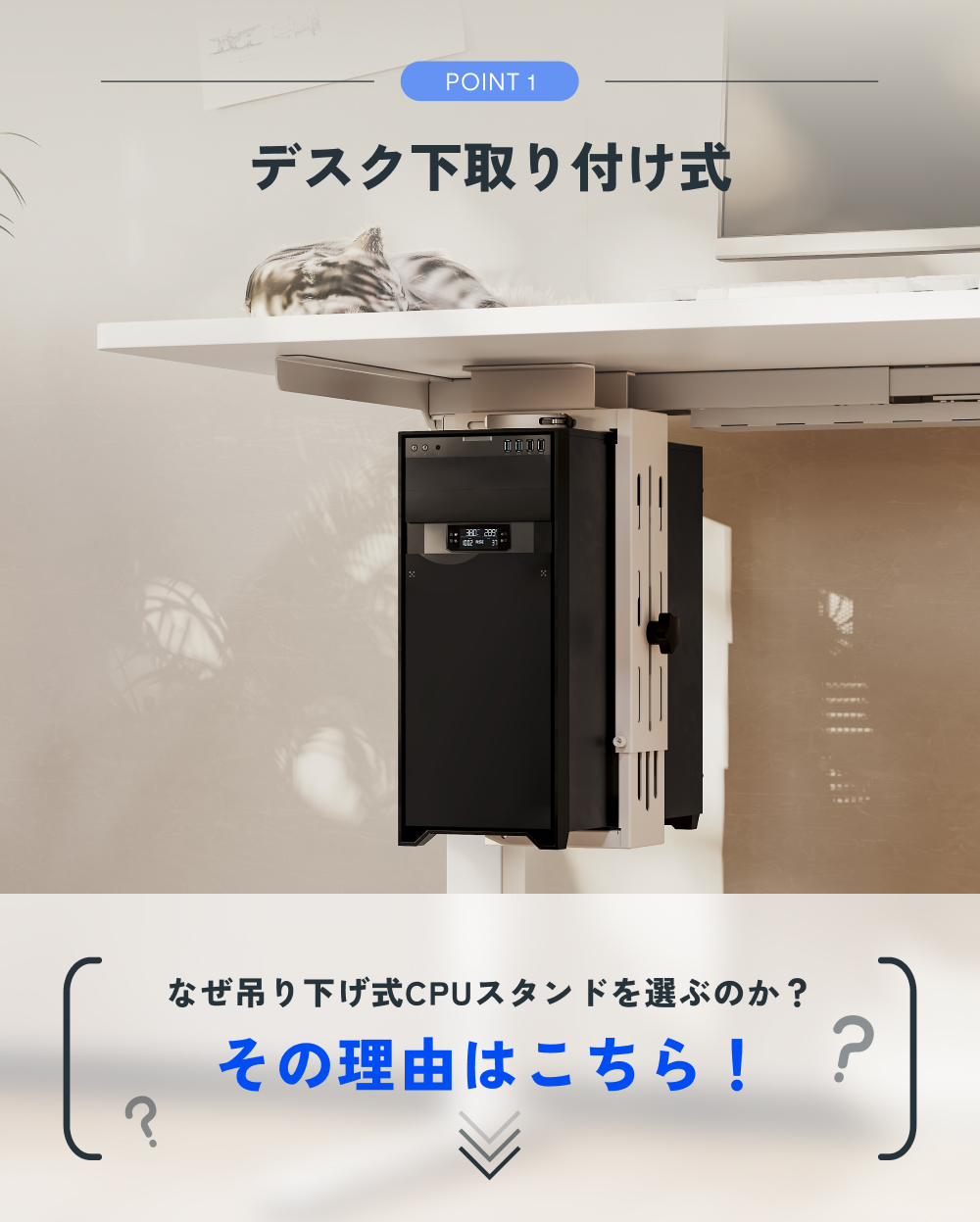 特に弊社のスタンディングデスクにすごくピッタリ商品です。デスクが上がってくる時パソコンのケーブルが足りなくなる可能性があります。この場合、パソコン本体はデスクと一緒に昇降したら問題解決です。