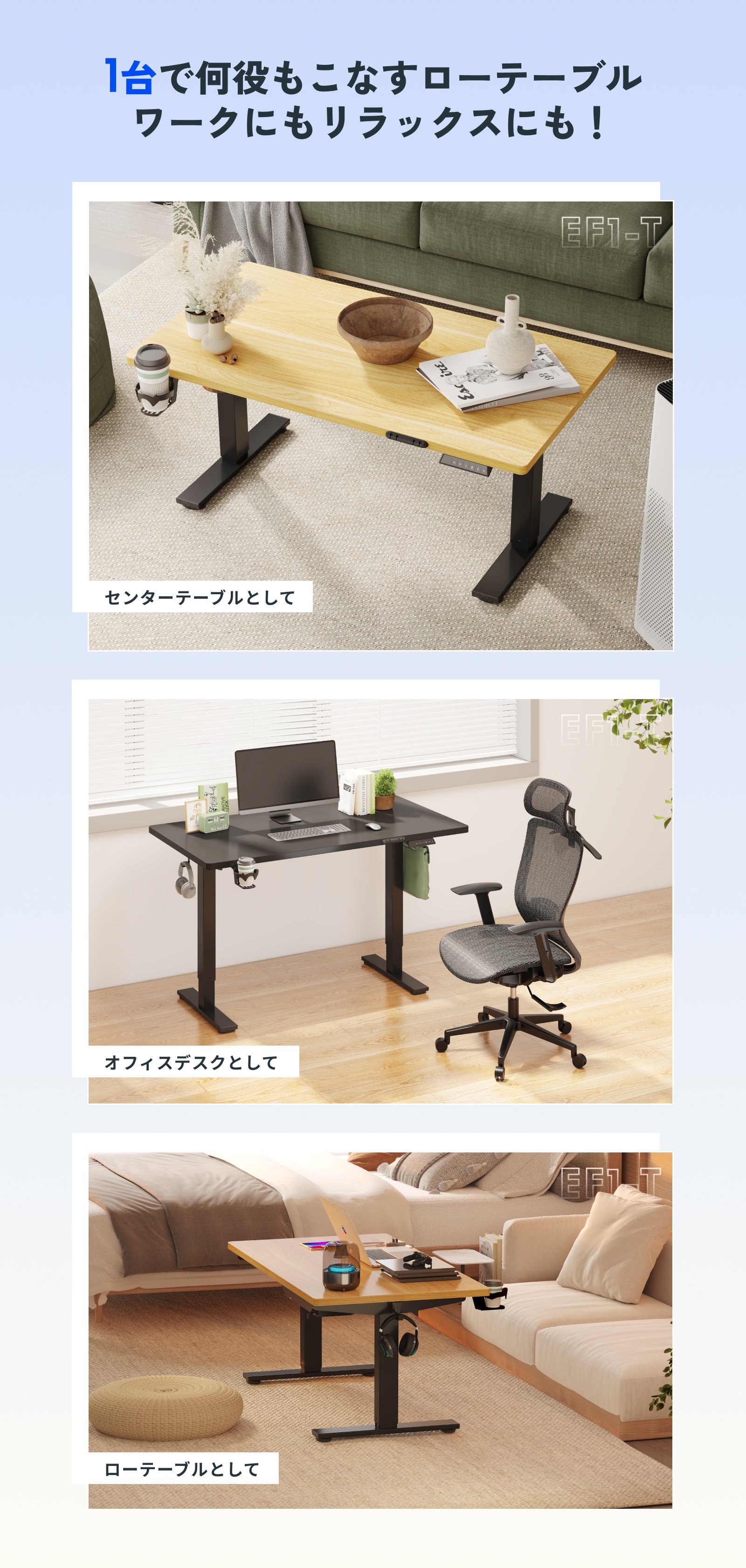 1、【1台で3役!ローテーブルにもデスクにもなる多用途設計】高さ48〜72cmの電動昇降に対応し、使い方自由自在。