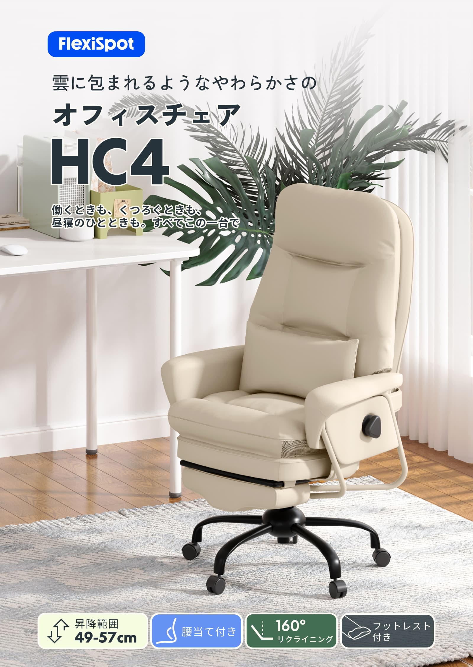 FlexiSpot オフィスチェア デスクチェア HC4 ソファチェア 4段階固定 PUレザー 座り心地 肉厚クッション 社長椅子 腰当て付き 座高調節 収納可能なオットマン