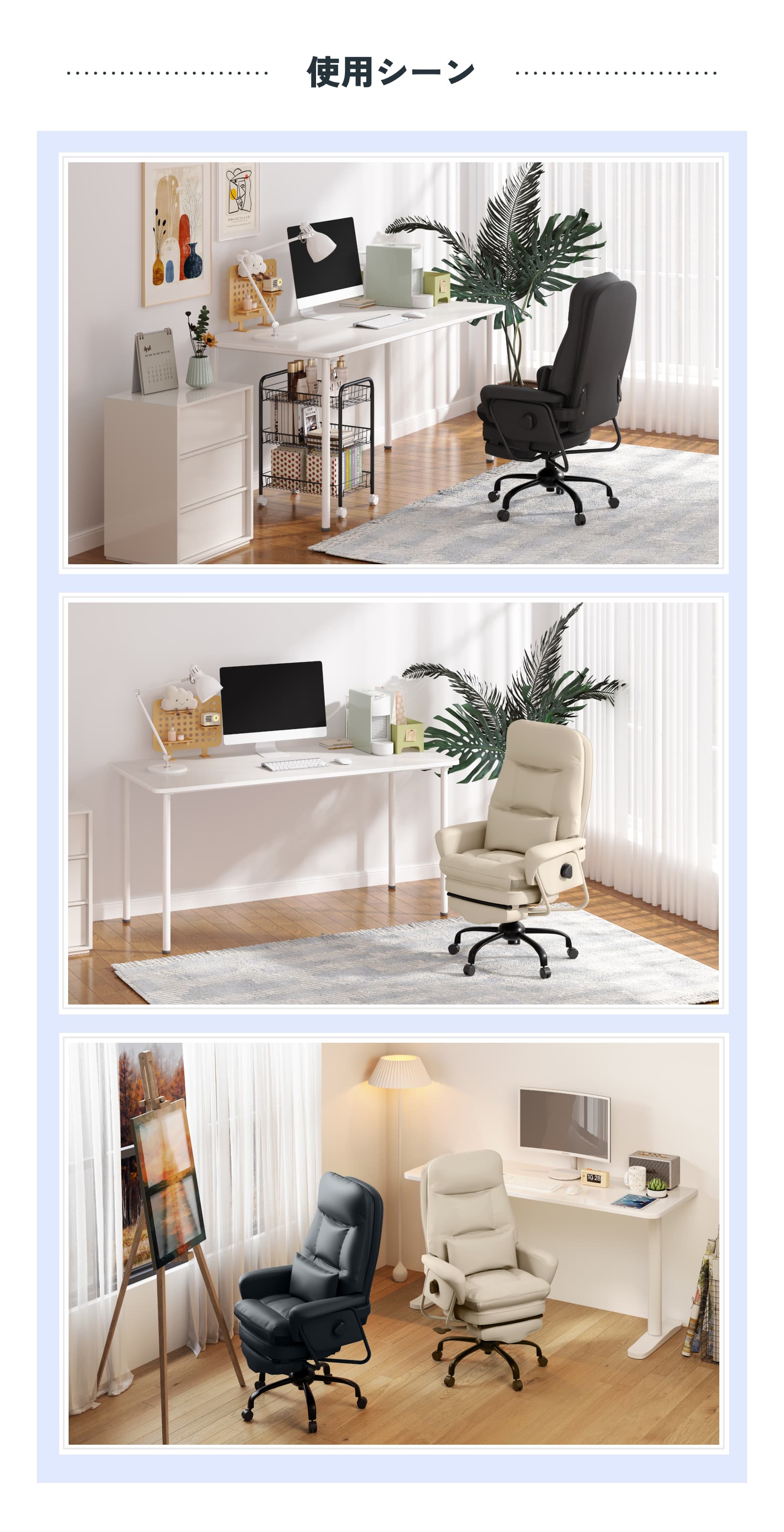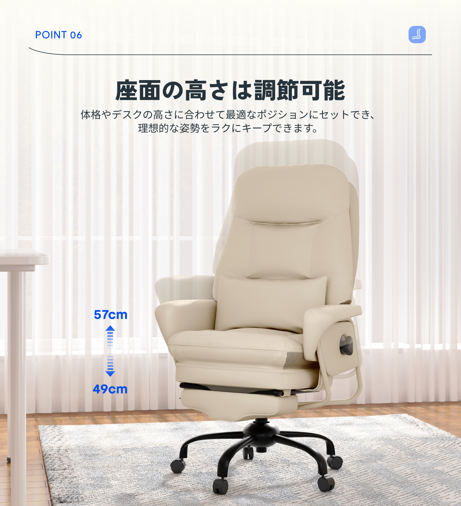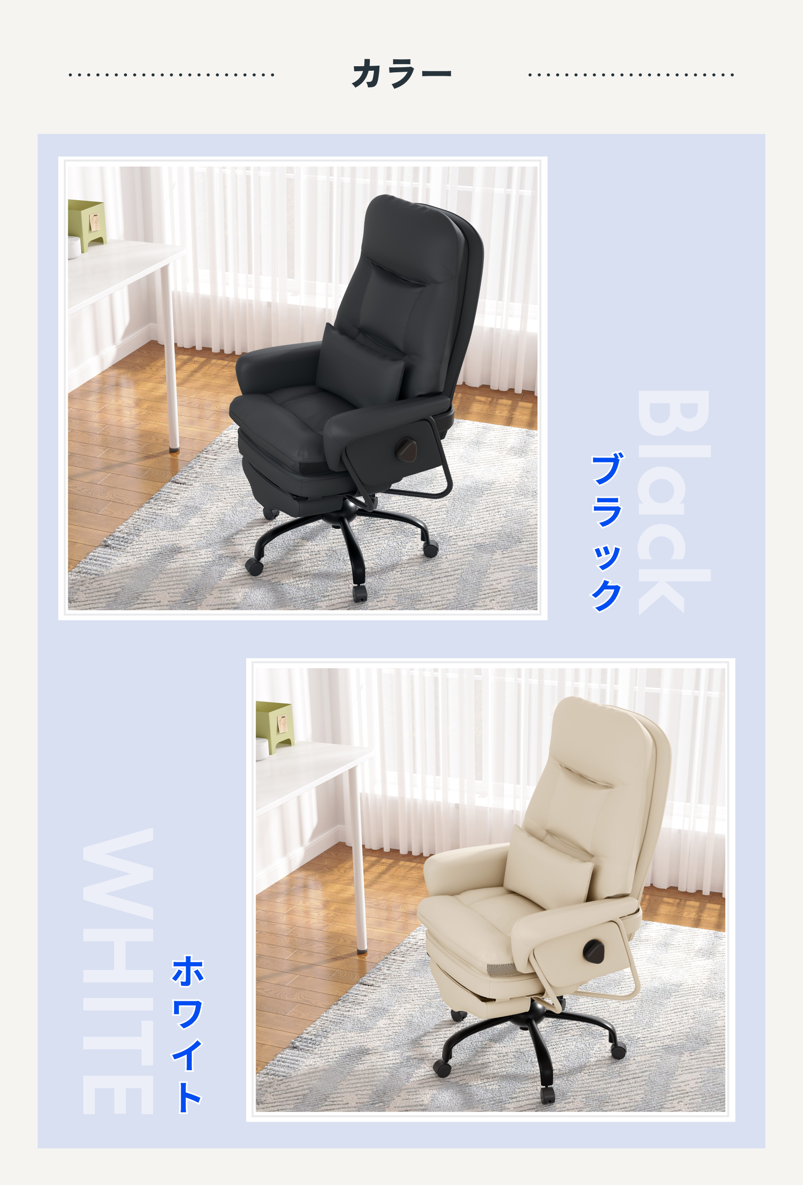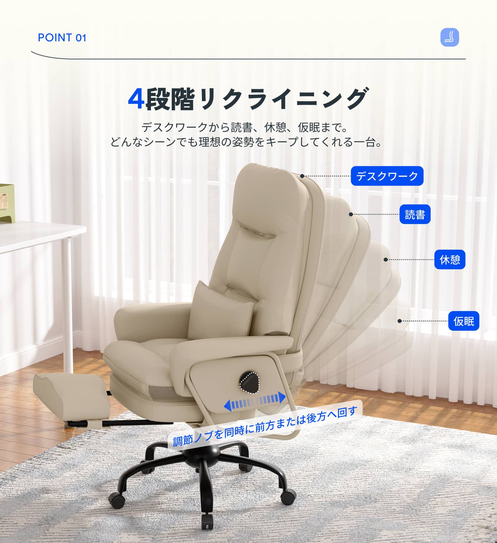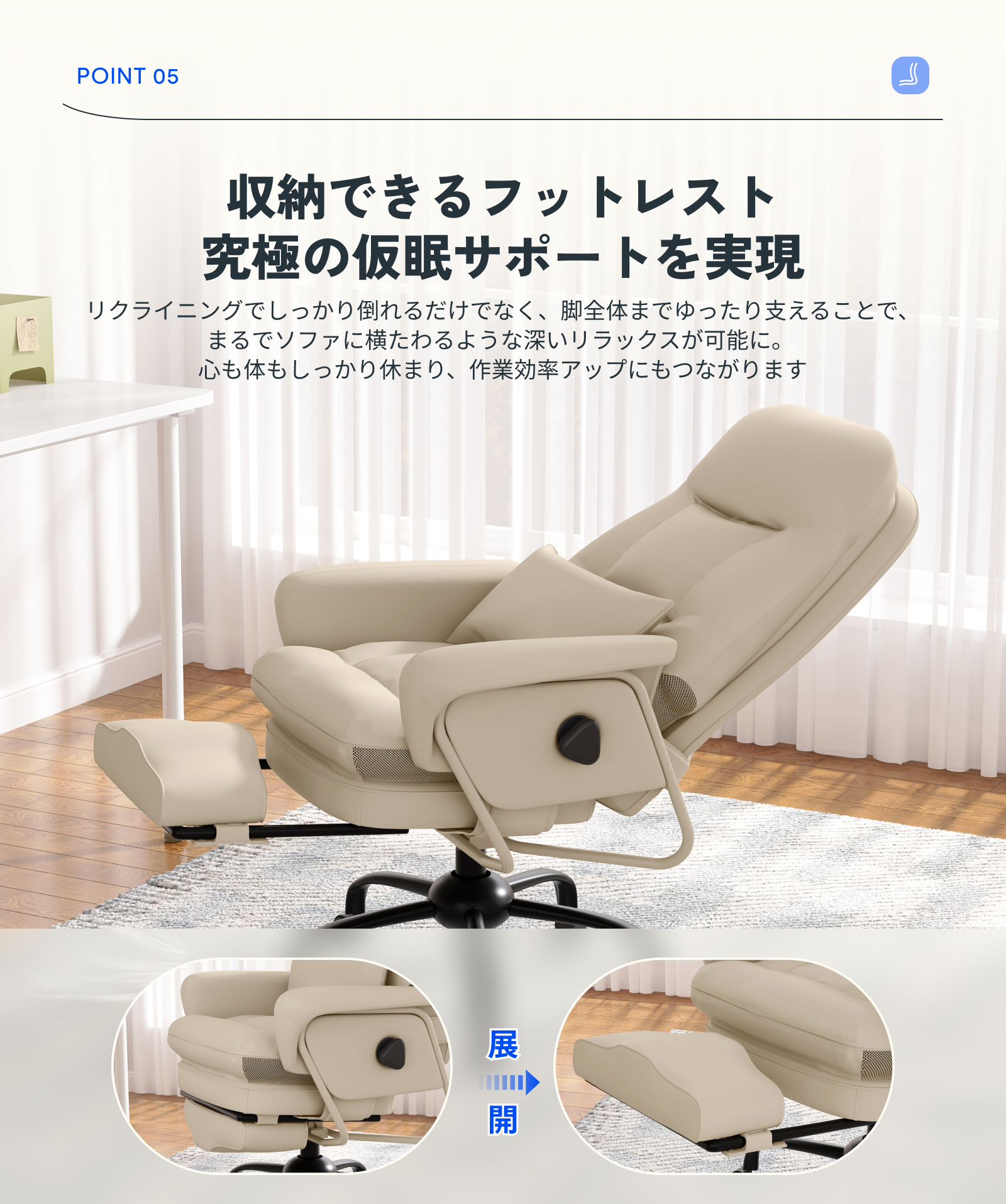 ・収納式オットマンで仮眠も快適:収納式オットマンが足全体を支え、ソファのような深いリラックス姿勢に。昼寝や休憩時にはほぼフラットに横になれ、疲労回復や作業効率アップに役立ちます。