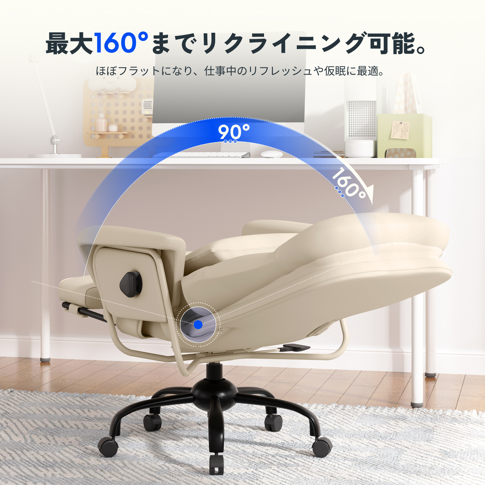 ・160°まで倒れるフラットチェア:最大160°の大角度リクライニングで、オフィスでも深い休息が可能。4段階角度ロックで作業・読書・休憩・仮眠に最適な姿勢をキープ。ロッキングで揺られながら、心身の緊張もリセットできます。