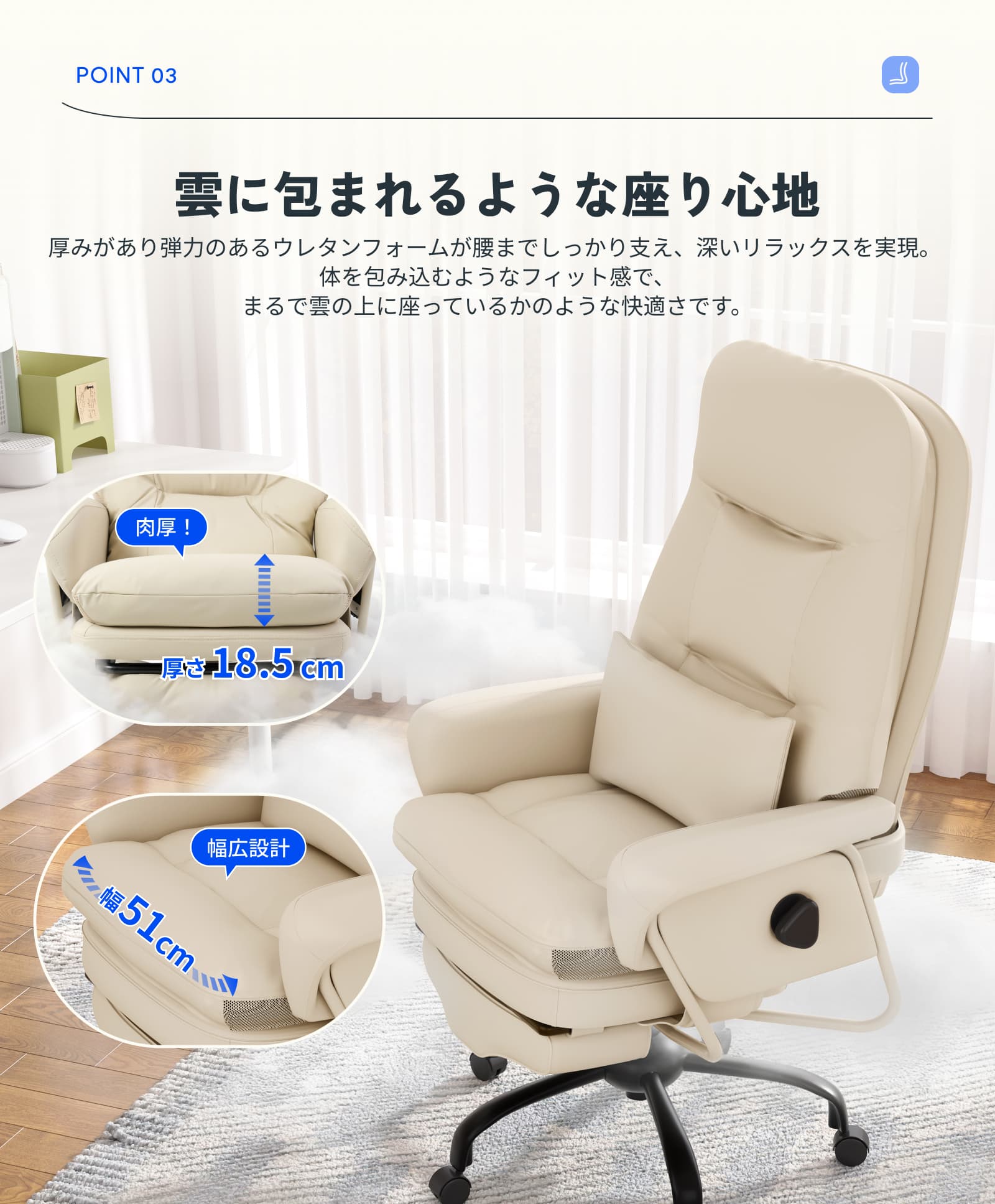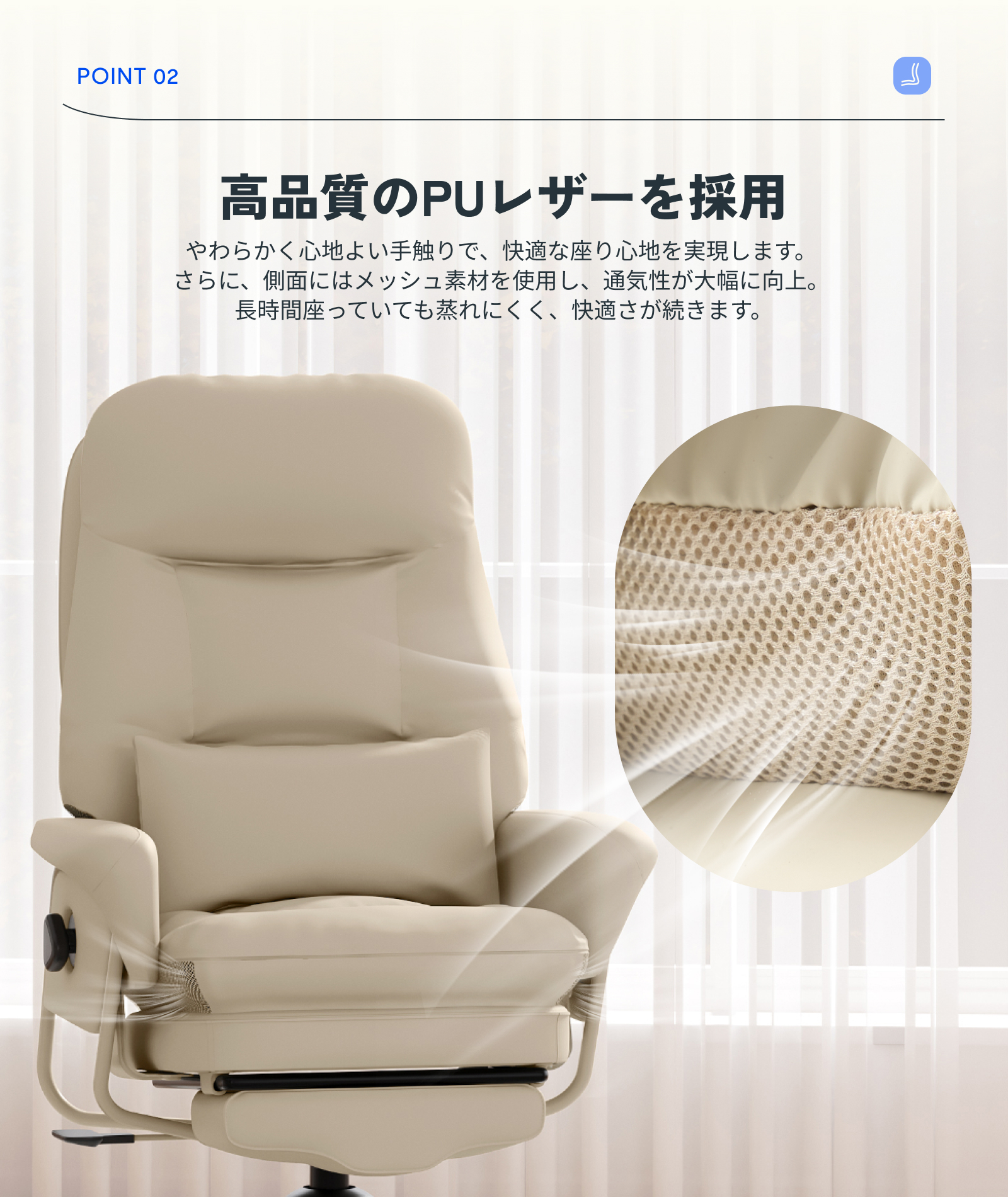 ・雲に包まれるような快適さ:上質PUレザーと厚手クッションが柔らかく体をホールド。独立腰当てクッションが腰を優しく支えます。側面メッシュで通気性も確保し、長時間でも蒸れにくく快適。作業も休憩も、心地よい座り心地でサポートします。