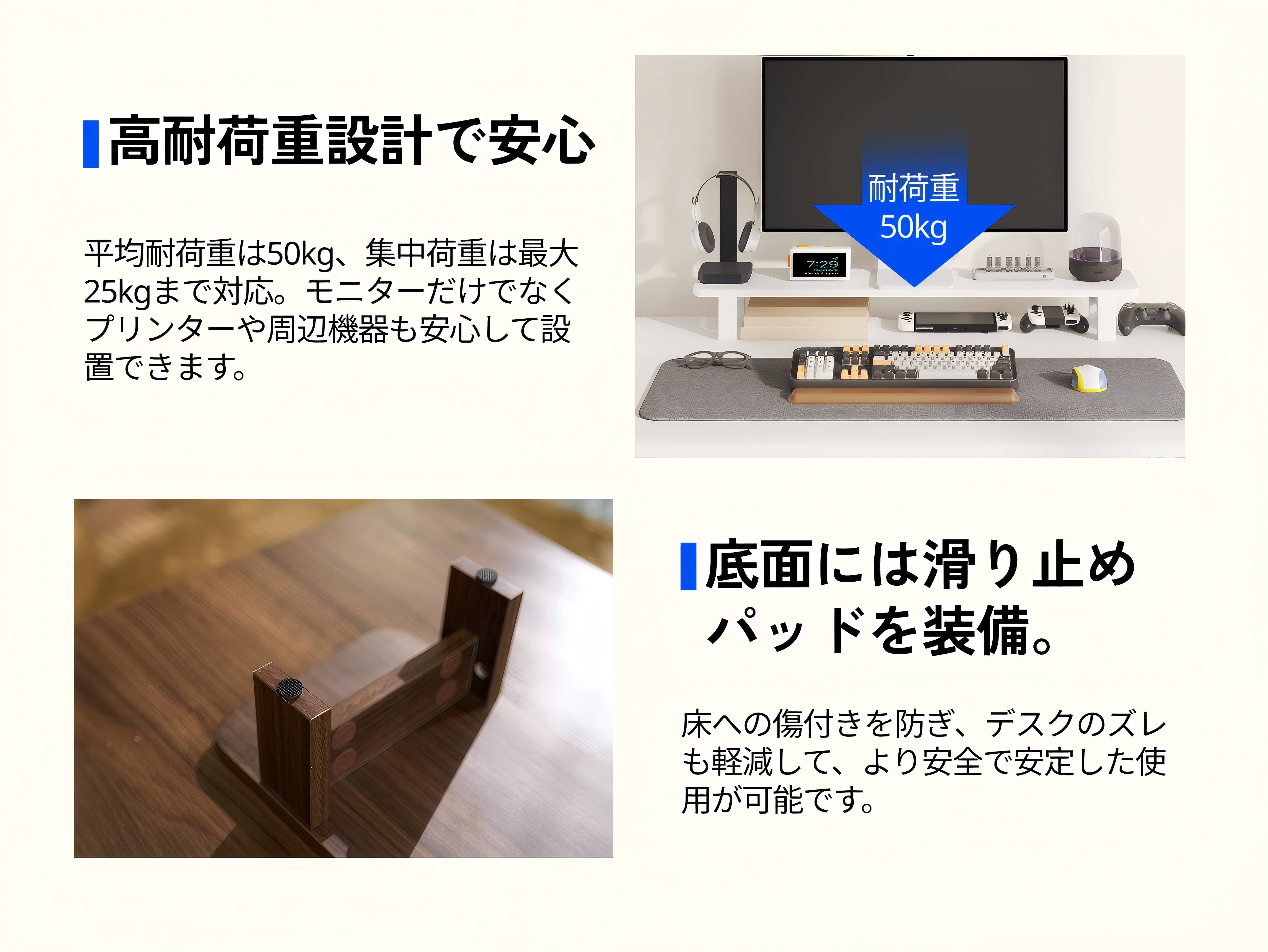 ・モニター台の下にスペースが儲けられ、書類置きやキーボード収納、小物の収納用に有効活用できます。