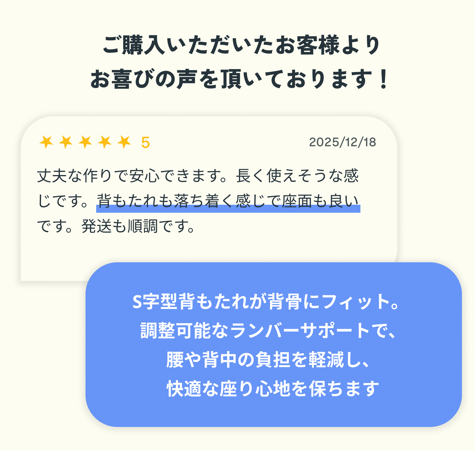 【S字背もたれが腰を優しく支える】人間工学デザインで背中にフィット。自然な姿勢を保ち、腰への負担を軽減します。