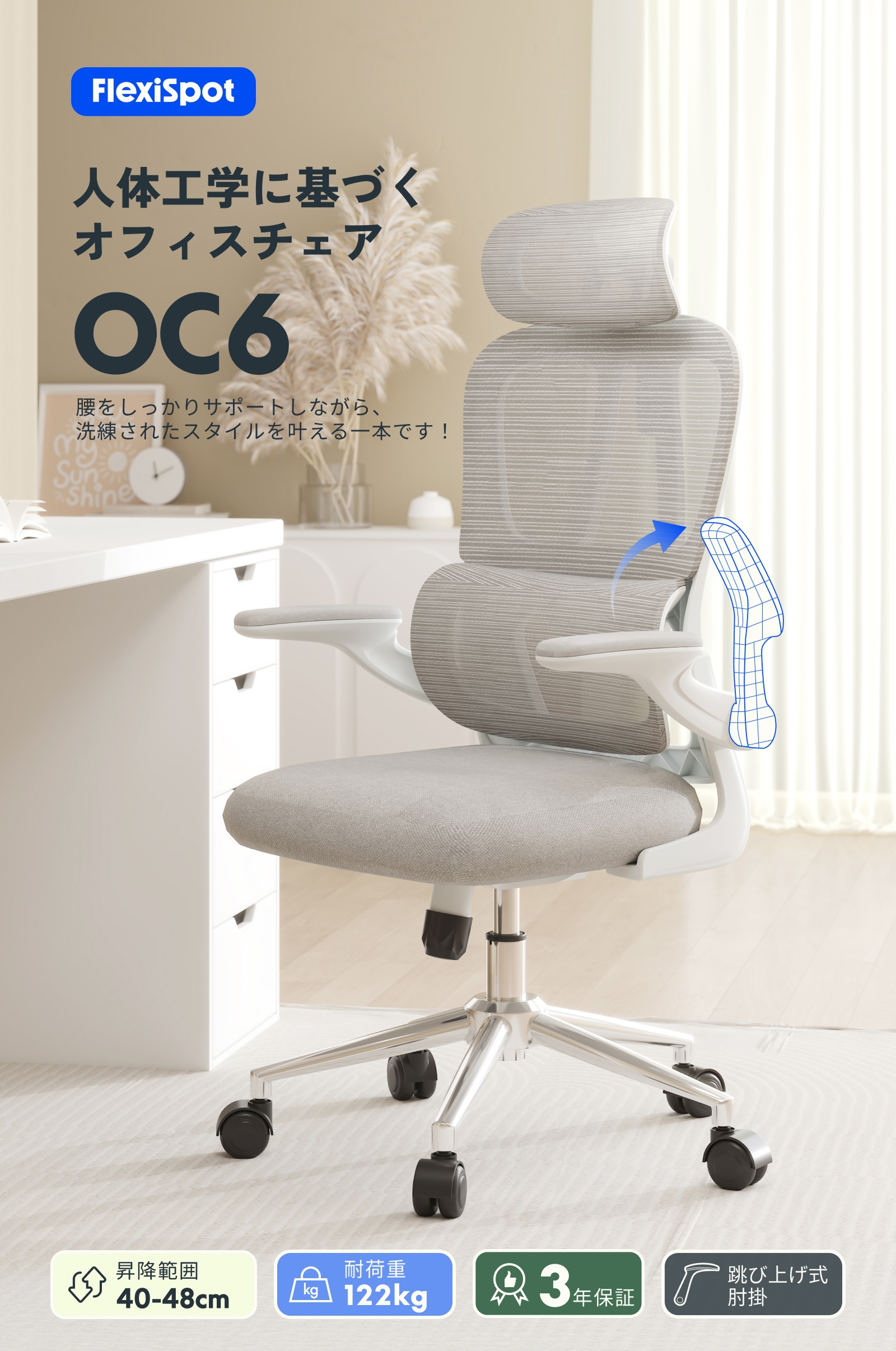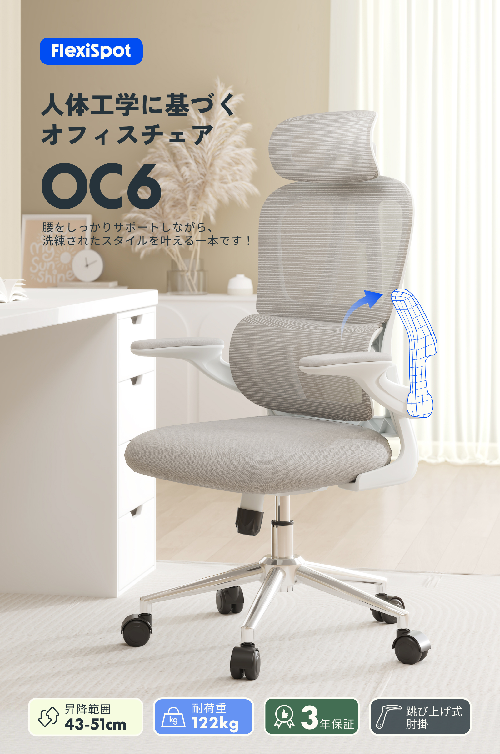 オフィスチェア リクライニング FlexiSpot OC6 デスクチェア 跳ね上げ式アームレスト メッシュ 肉厚座面 肘付き ランバーサポート 人間工学 ハイバック 爆買